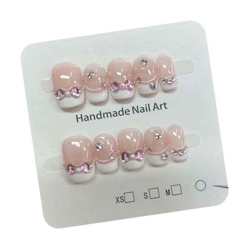 10Pcs Handmade Press On Nails Short Oval Glitter French Fake Nails Full Cover Pink 3D Bow Diamond Design Wearable Nail Tips Art