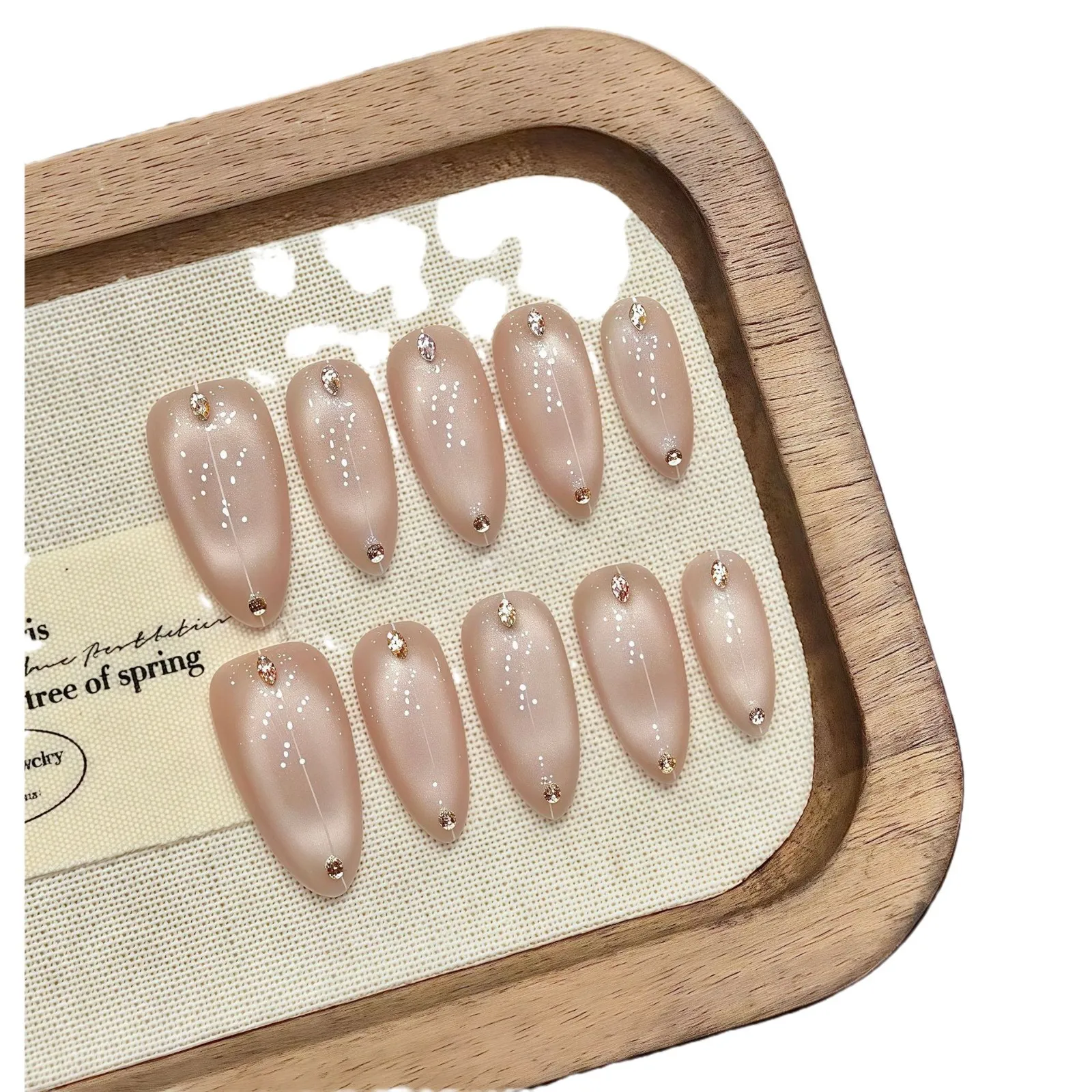 10pcs Handmade Sweet Cat Eye French Press on Nails Shiny Almond Rhinestone Design Nails Art Full Cover Wearable Manicure