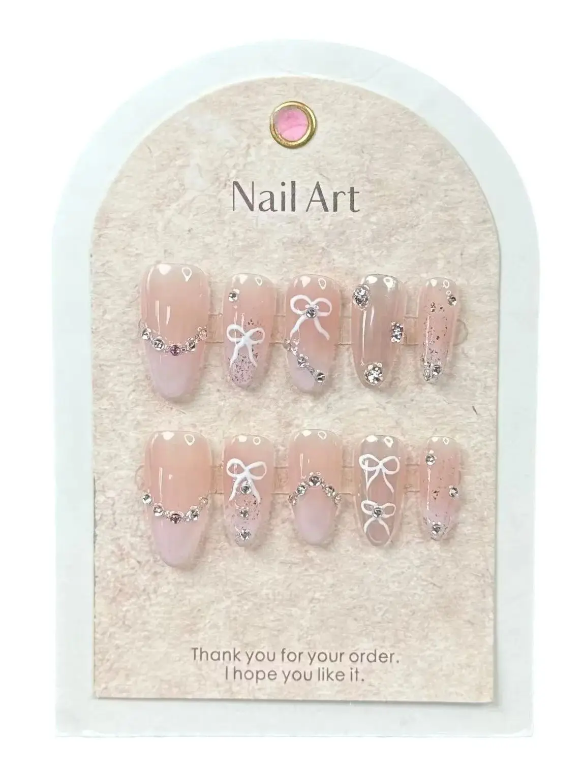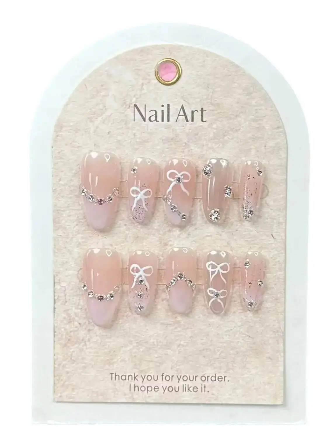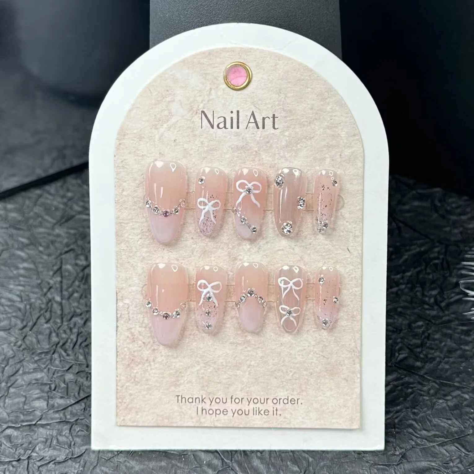 10Pcs Pink Handmade Press on Nails Full Cover Bow Tie Rhinestone Design French Fake Nails Wearable Manicure Nail Tips Art