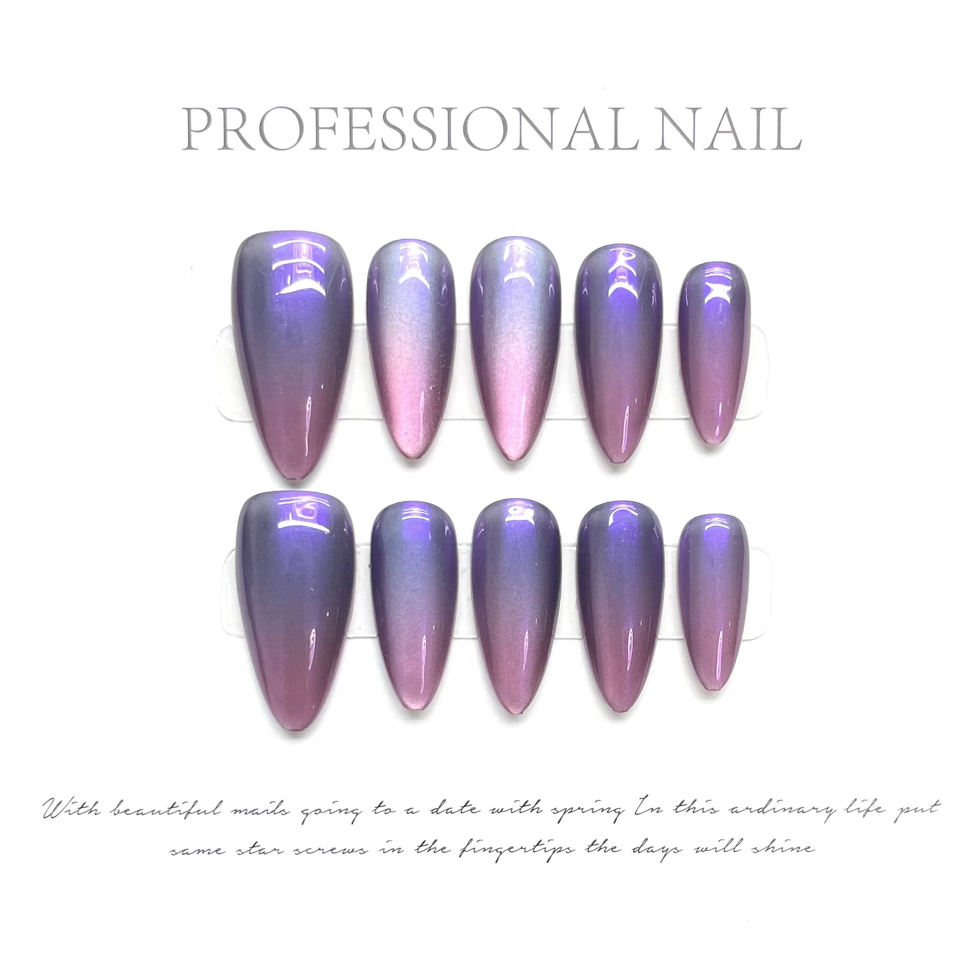 10Pcs Shiny Handmade Press on Nails Cherry Solid Color Almond Cat Eye Design Fake Nails Sparkling Removable Manicure Nail Women