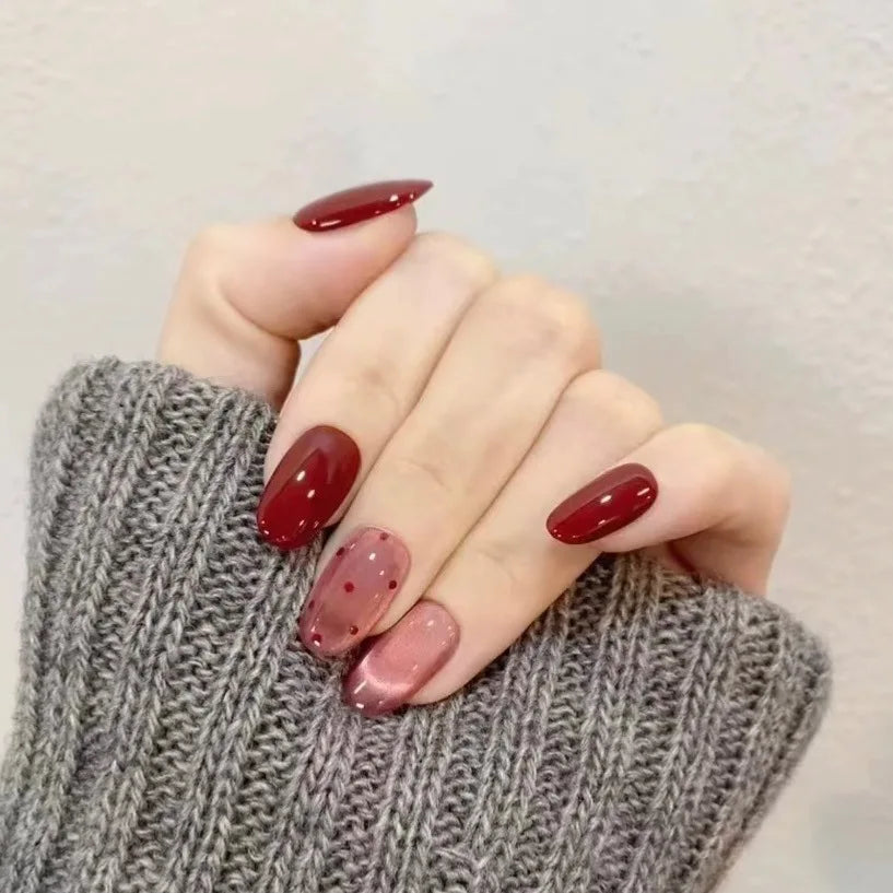10 pcs Handmade French Press on Nails Oval Glitter Cat Eye Design Red False Nail Wearable False Nails Tips For Girls Women