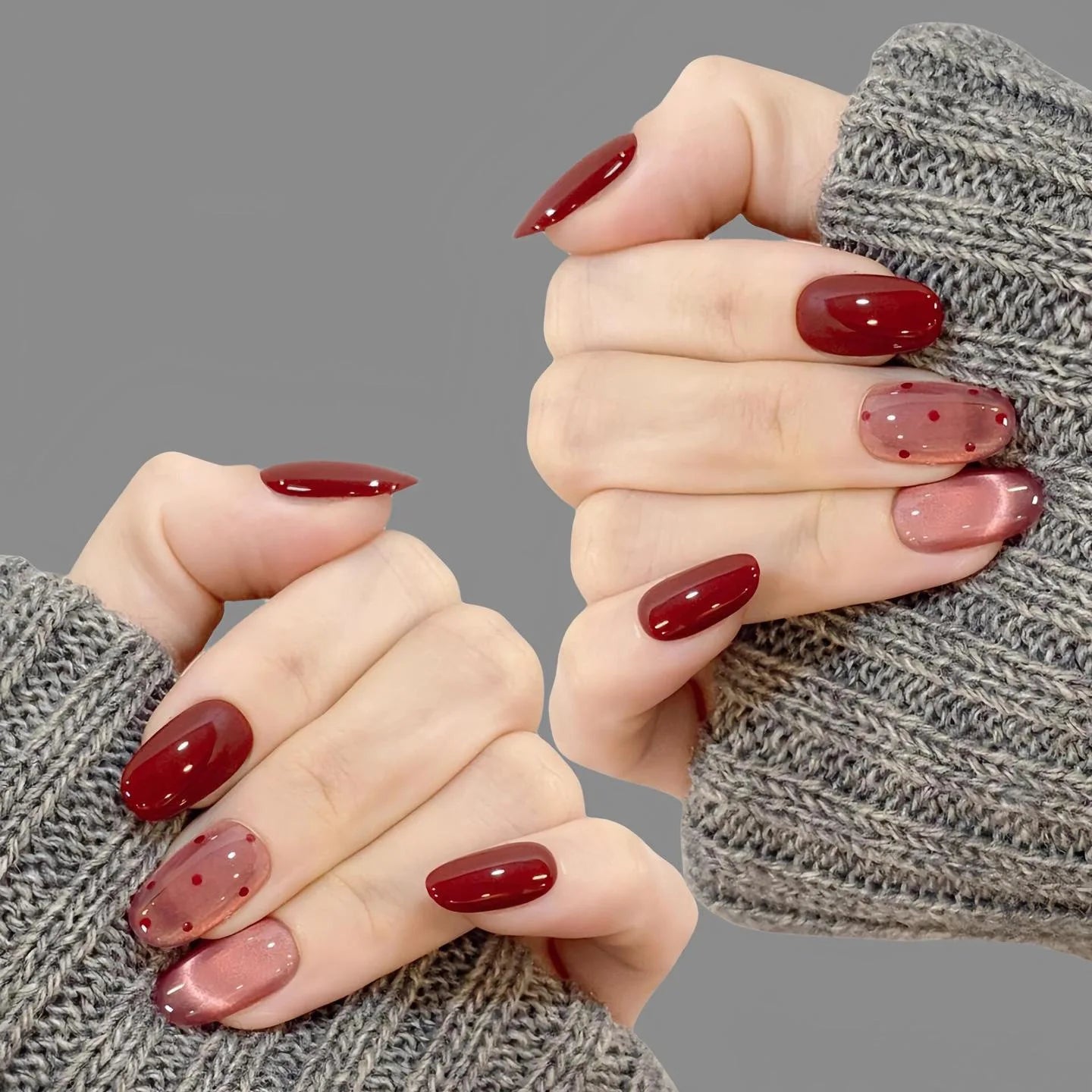 Qfdian 10 pcs Handmade French Press on Nails Oval Glitter Cat Eye Design Red False Nail Wearable False Nails Tips For Girls Women