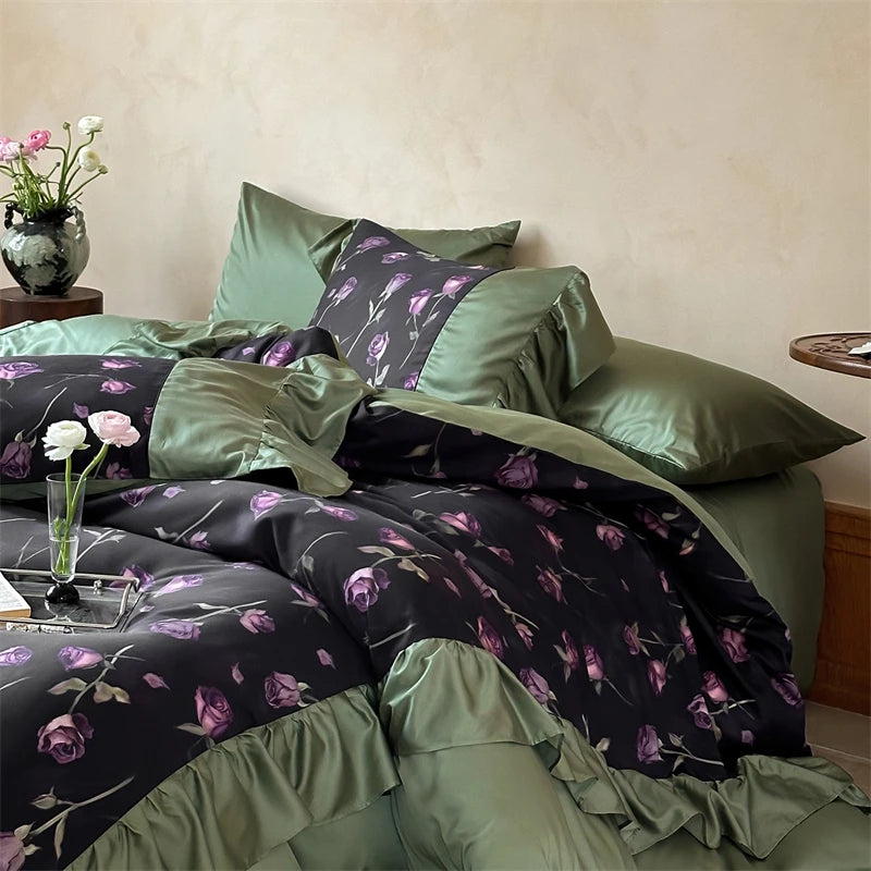 Qfdian 1000TC Egyptian Cotton Vintage Rose Prints Pleated Ruffles Purple Bedding Set Duvet Cover Flat/Fitted Bed Sheet Pillowcases 4Pcs