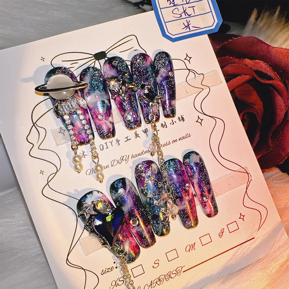 Qfdian 10P High Quality Handmade Press on Nails Cosmic Star Curse Constellation Sense Dark Explosion Flash Nail Art Real Shot Hot Girl