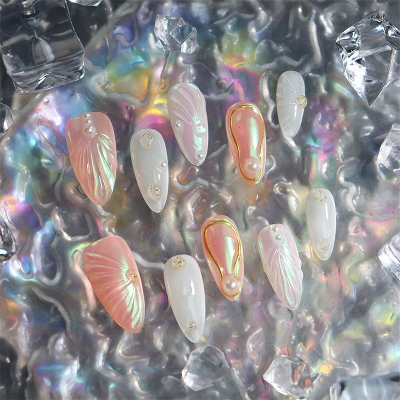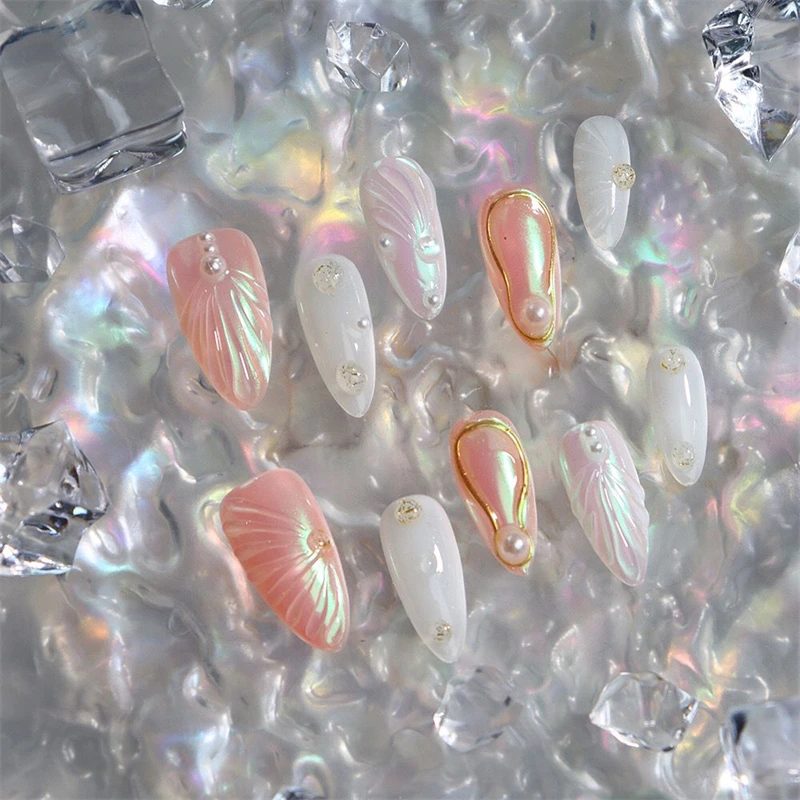 Qfdian 10pcs Almond Handmade Press On Nails Pearl Shell Aurora Design Meddle-length Full Cover Wear Manicure Art Finger Tips Decoration