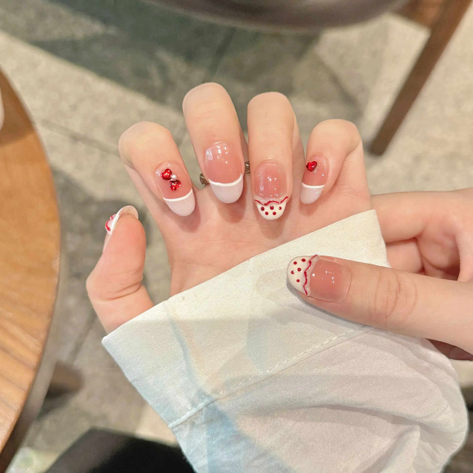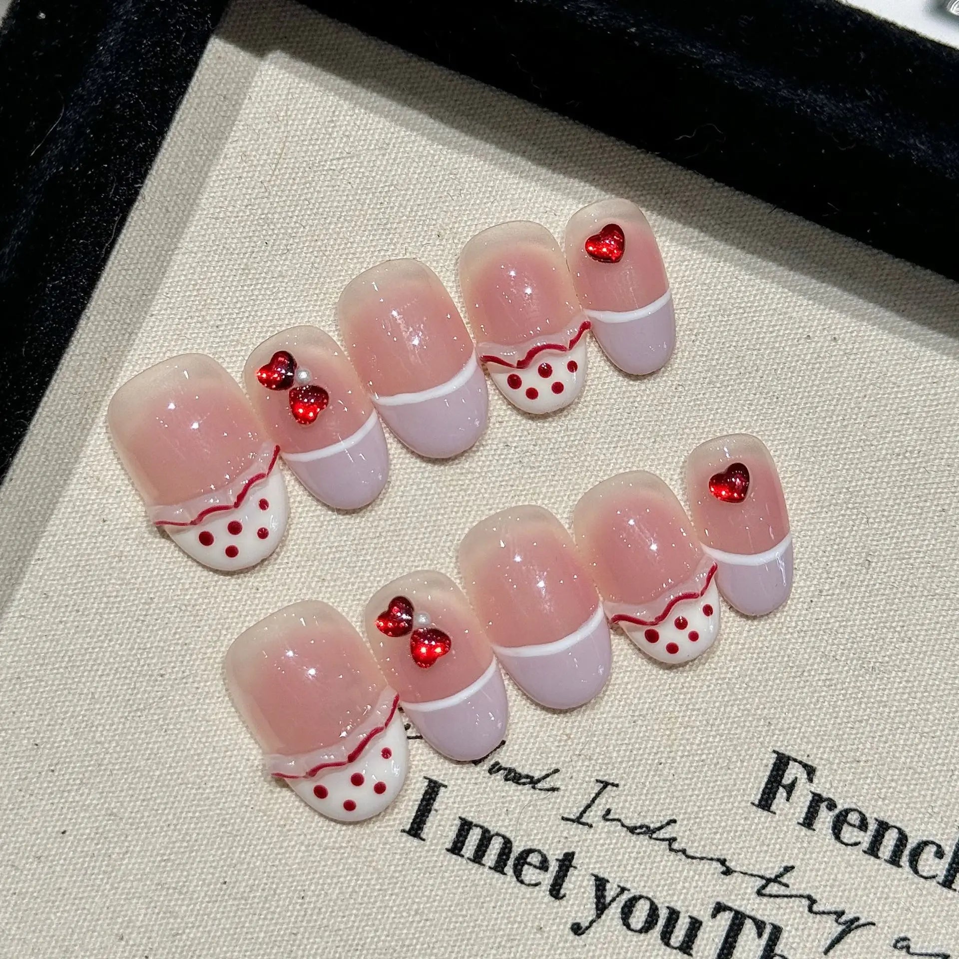 Qfdian 10Pcs Cute Dot French Handmade False Nails Press On Nails Wearable Fake Nails Short Oval With Bow Small Love Diamond Decor Nails
