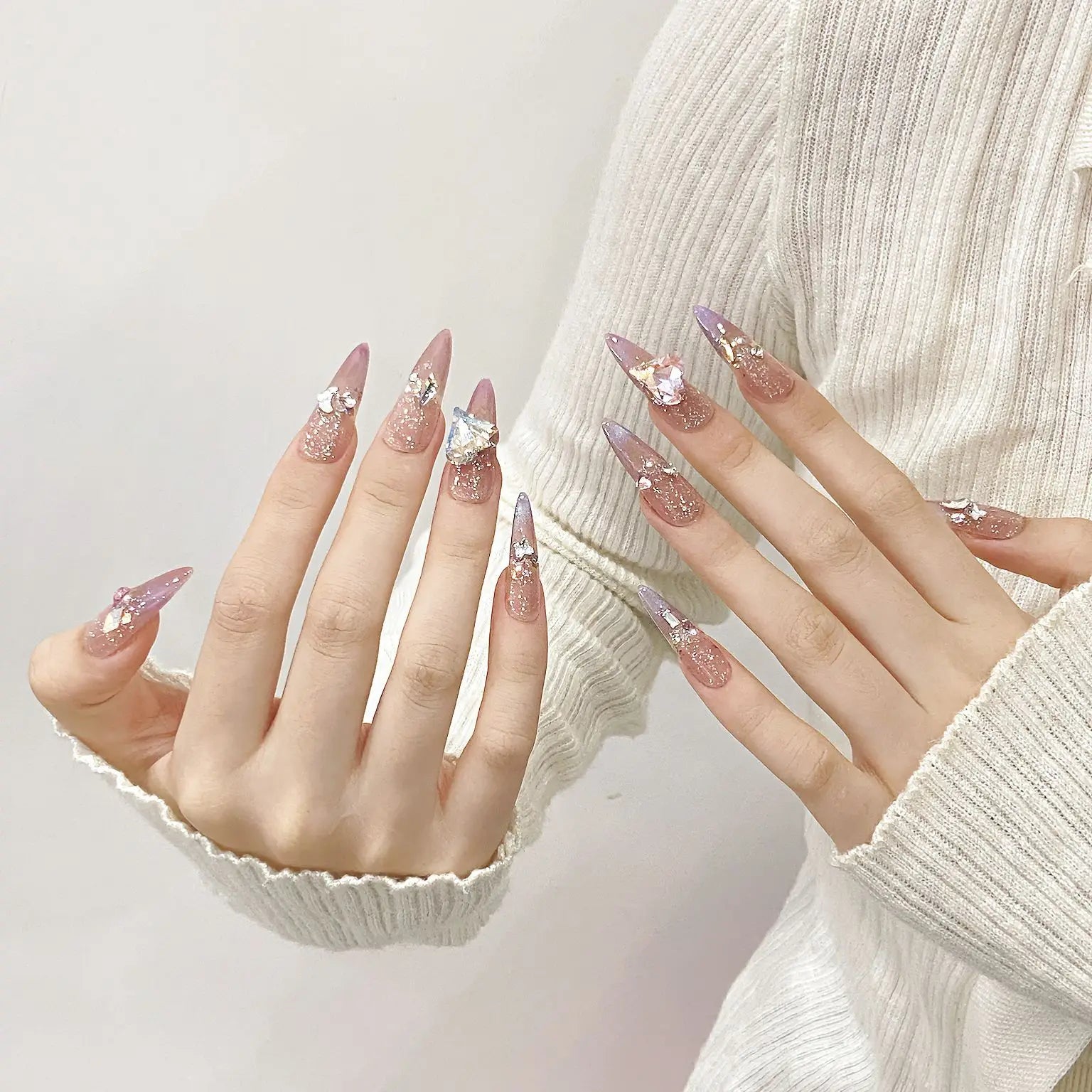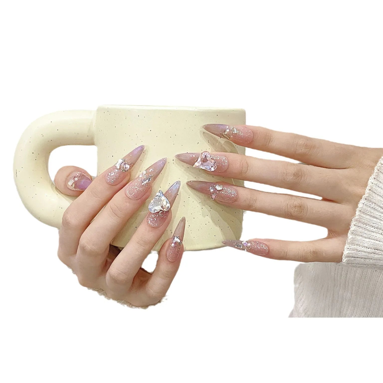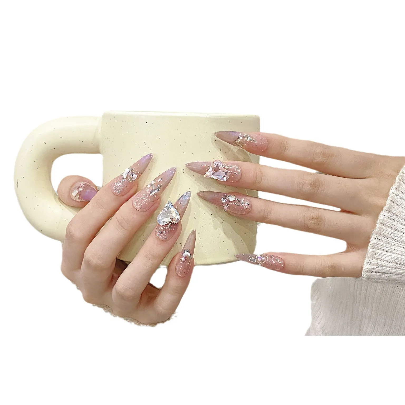 10pcs detachable gradient pink French rhinestones long almond press on nails handmade acrylic stiletto fake nails tips