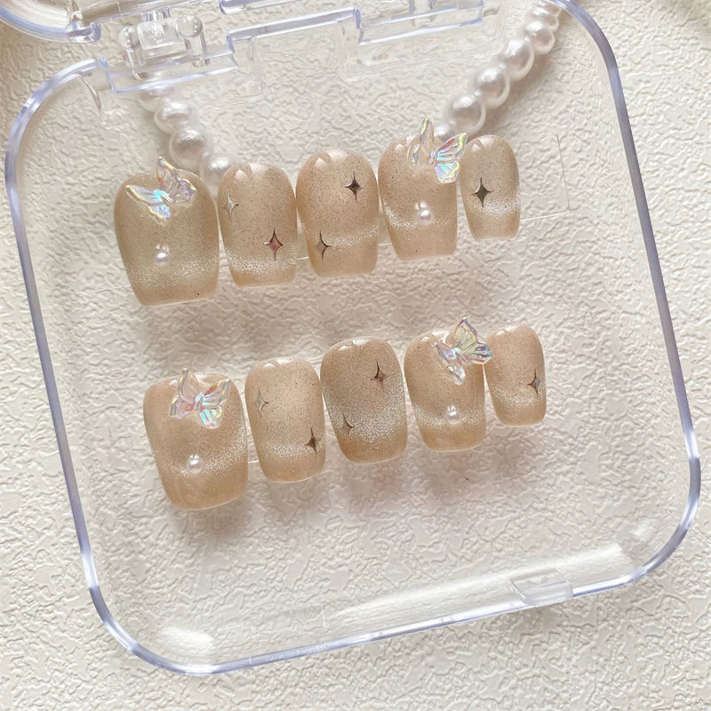 Qfdian 10Pcs Glitter Handmade Press On Nails Short Gradient Full Cover Butterfly Design False Nails Manicure Wearable Nail Tips Art