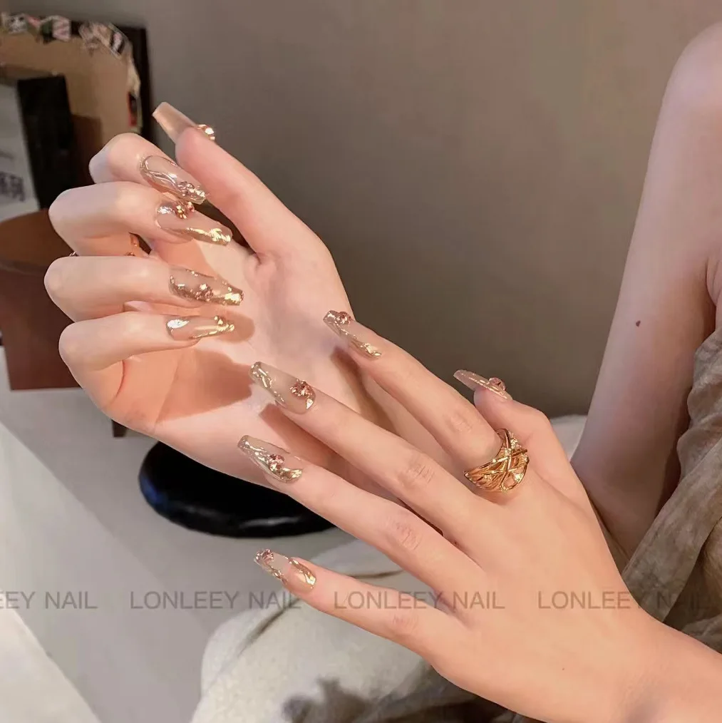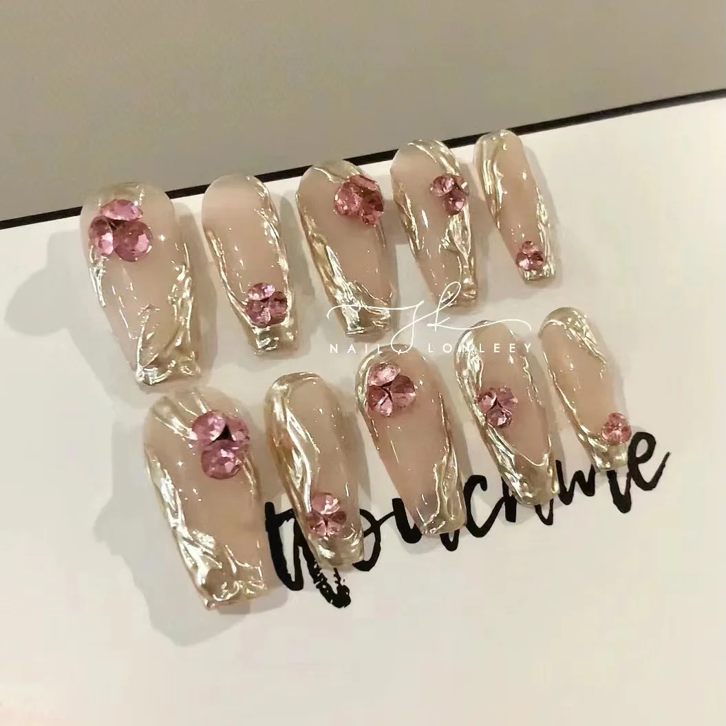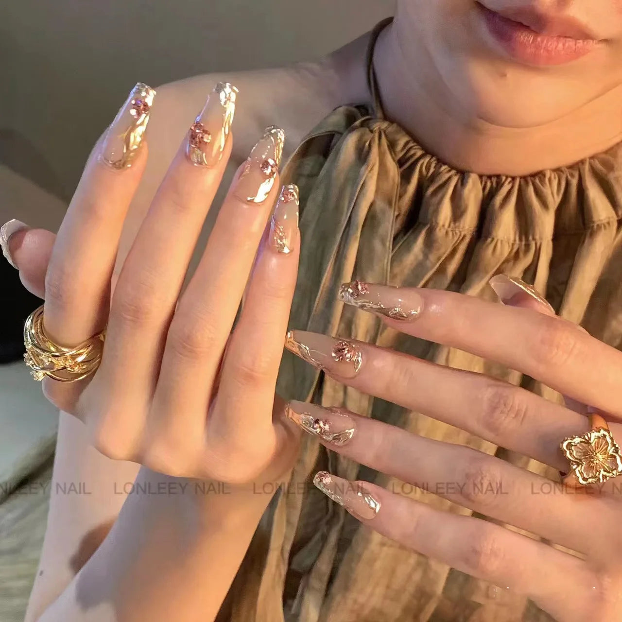 10pcs handmade french ballet press on acrylic nails magic mirror powder false nails rose designs fake nails removable nail