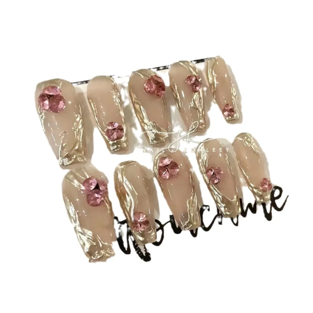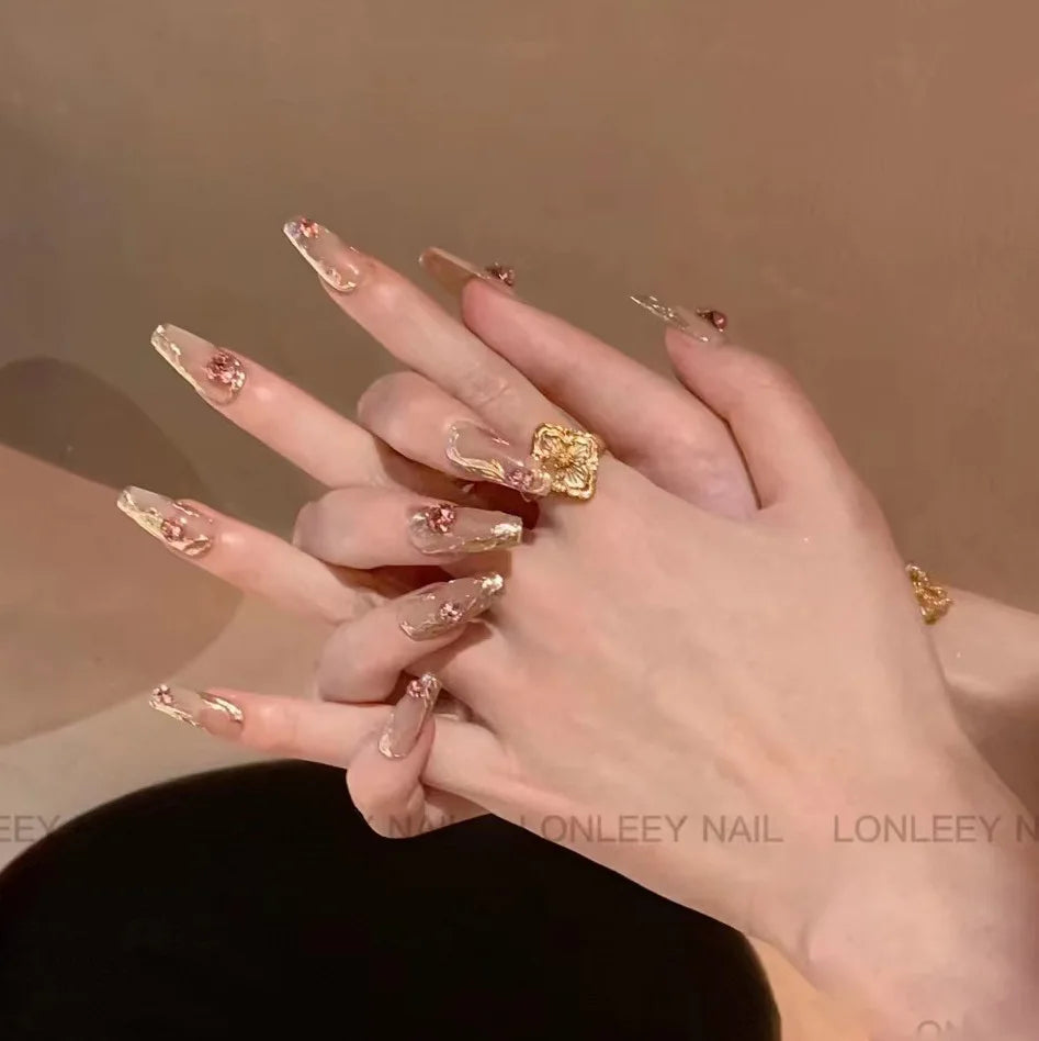 Qfdian 10pcs handmade french ballet press on acrylic nails magic mirror powder false nails rose designs fake nails removable nail