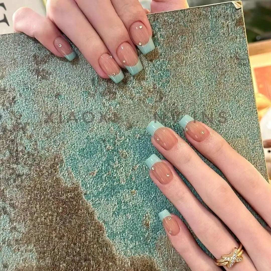 10pcs Handmade French False Nails Short Fake Nails Press on Blue Edge Design Wearable Simple Ins Nail Manicure Nail Tips