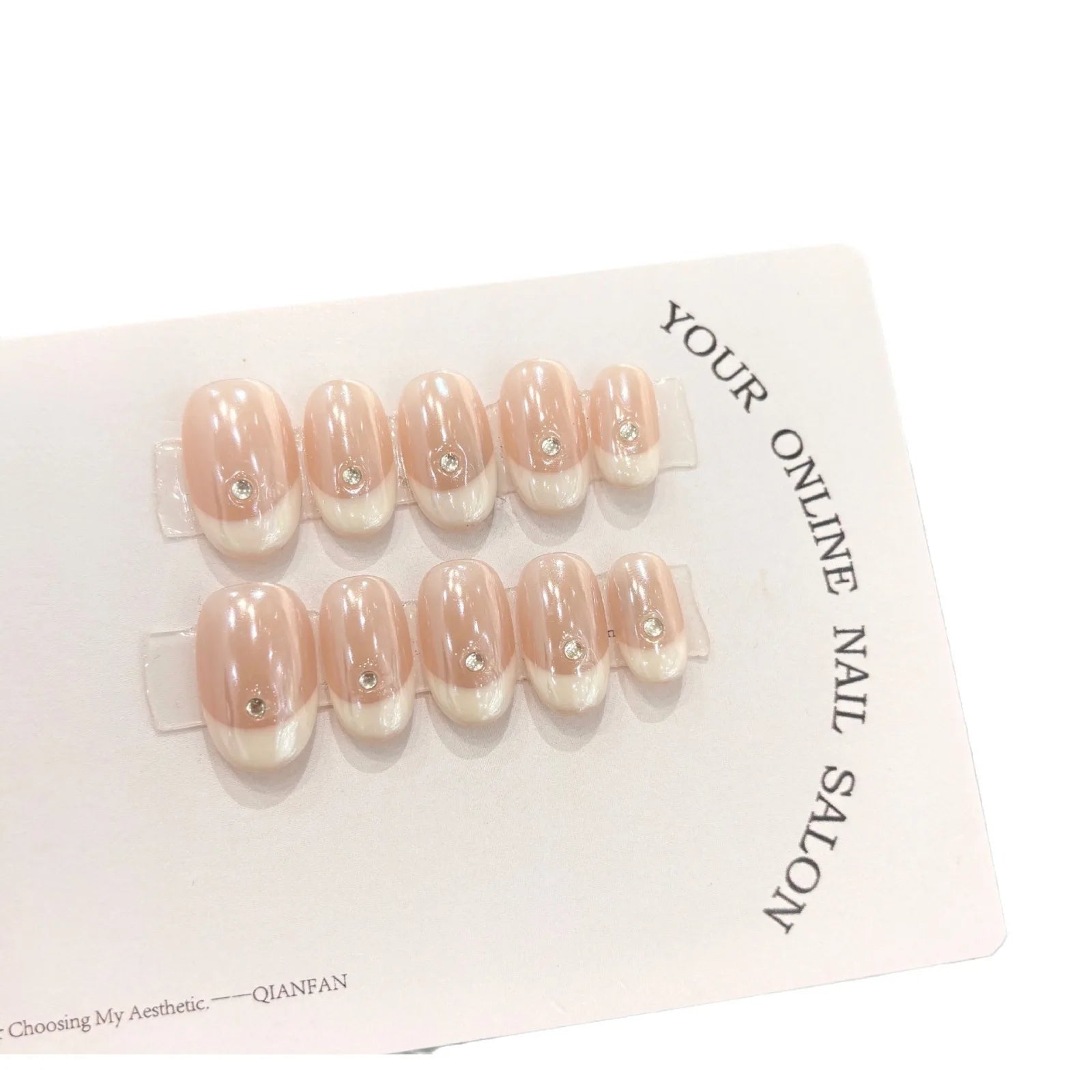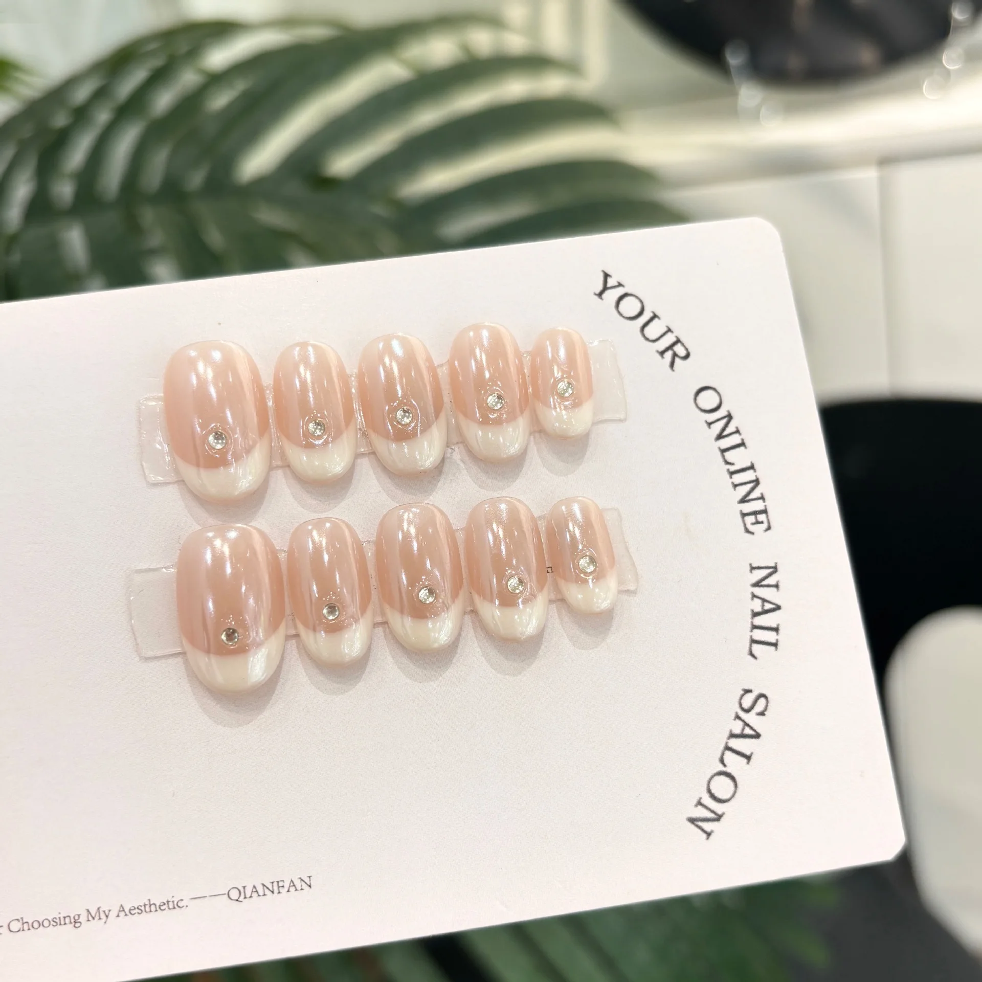 Qfdian 10pcs Handmade Oval Press On Nails Aurora French False Nails White Edge Rhinestone Design Nails Art Full Cover Wearable Manicure