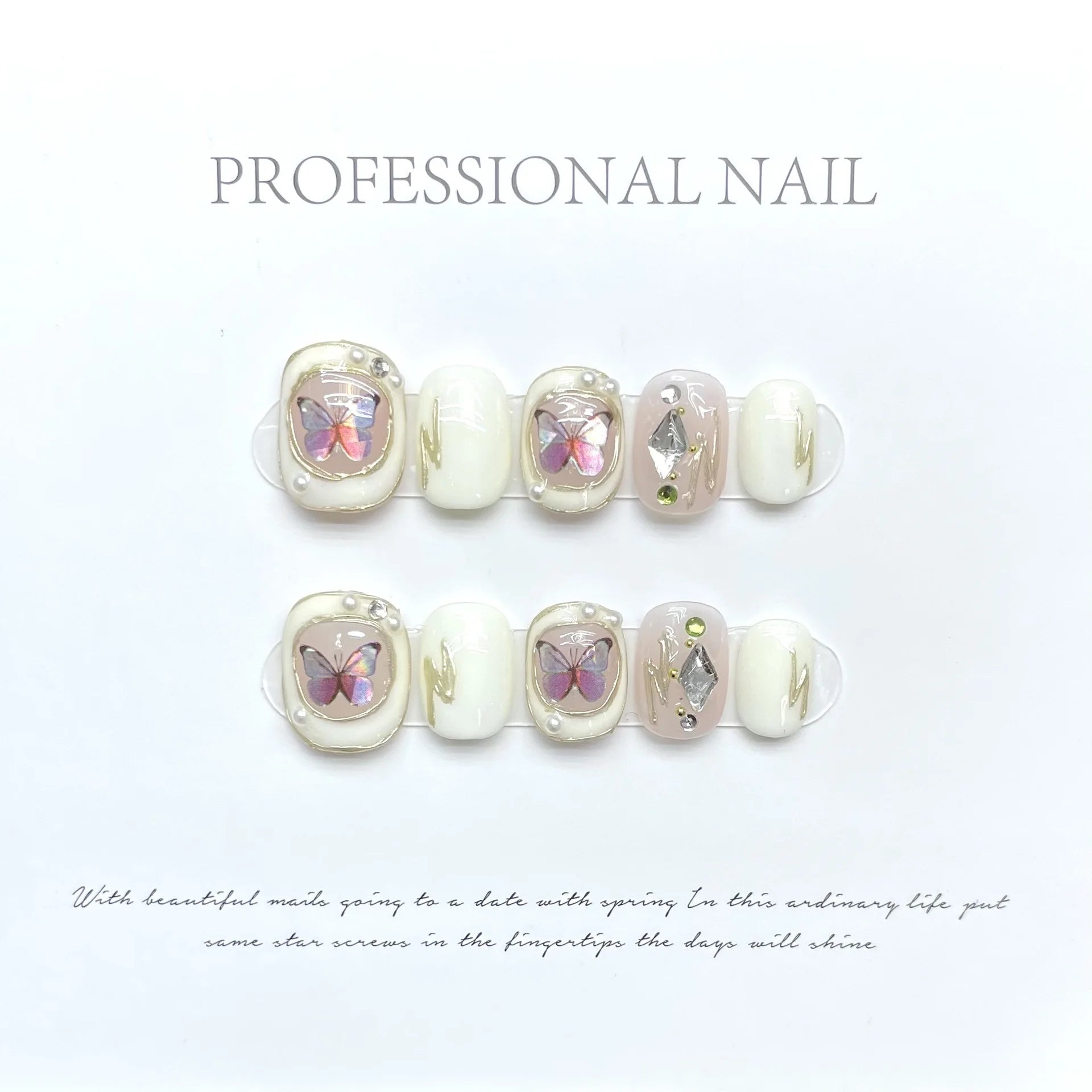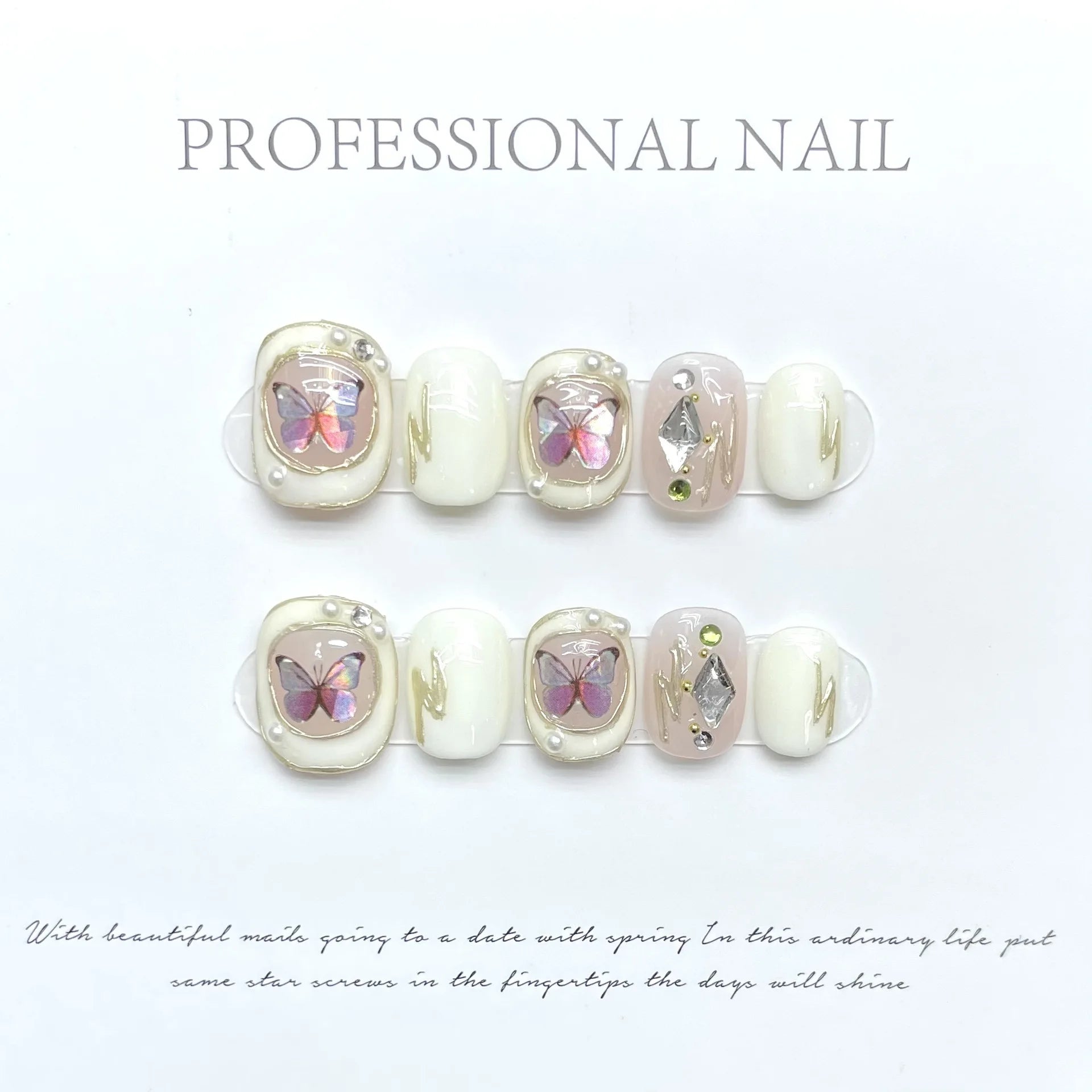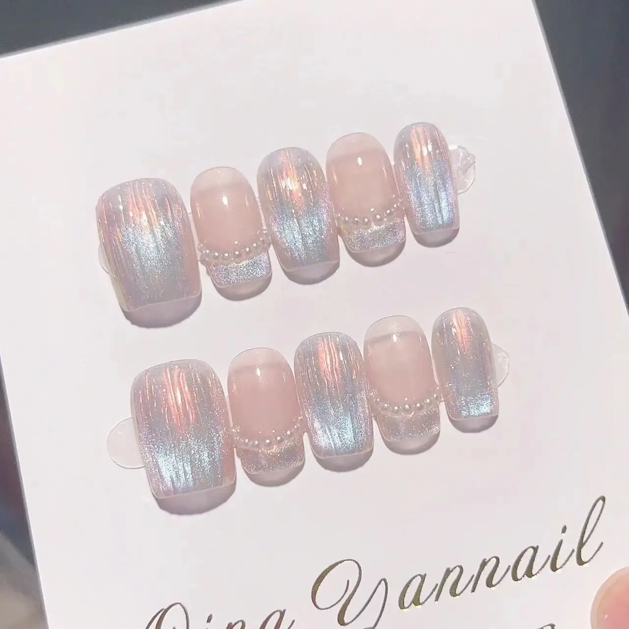 Qfdian 10Pcs Handmade Press on Nails Full Cover Cat Eye Pearls Design French Ballerina False Nails Wearable Manicure Nail Tips Art