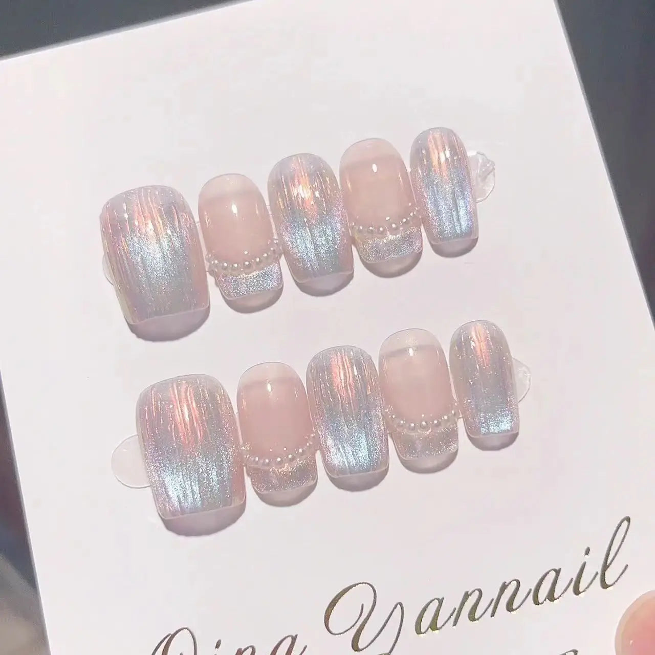 10Pcs Handmade Press on Nails Full Cover Cat Eye Pearls Design French Ballerina False Nails Wearable Manicure Nail Tips Art
