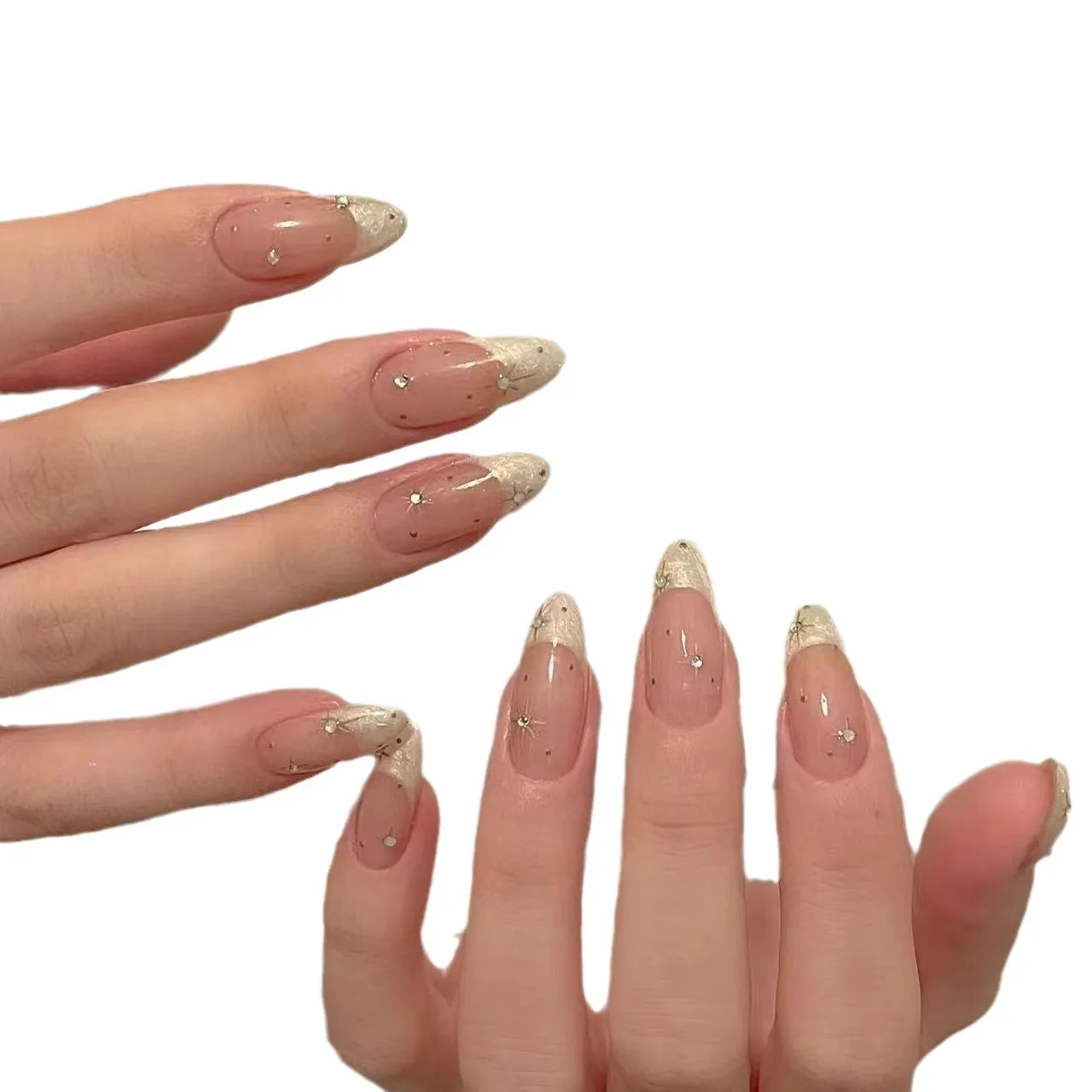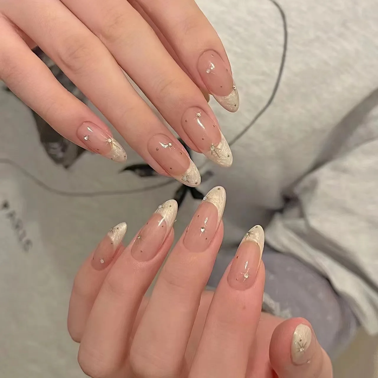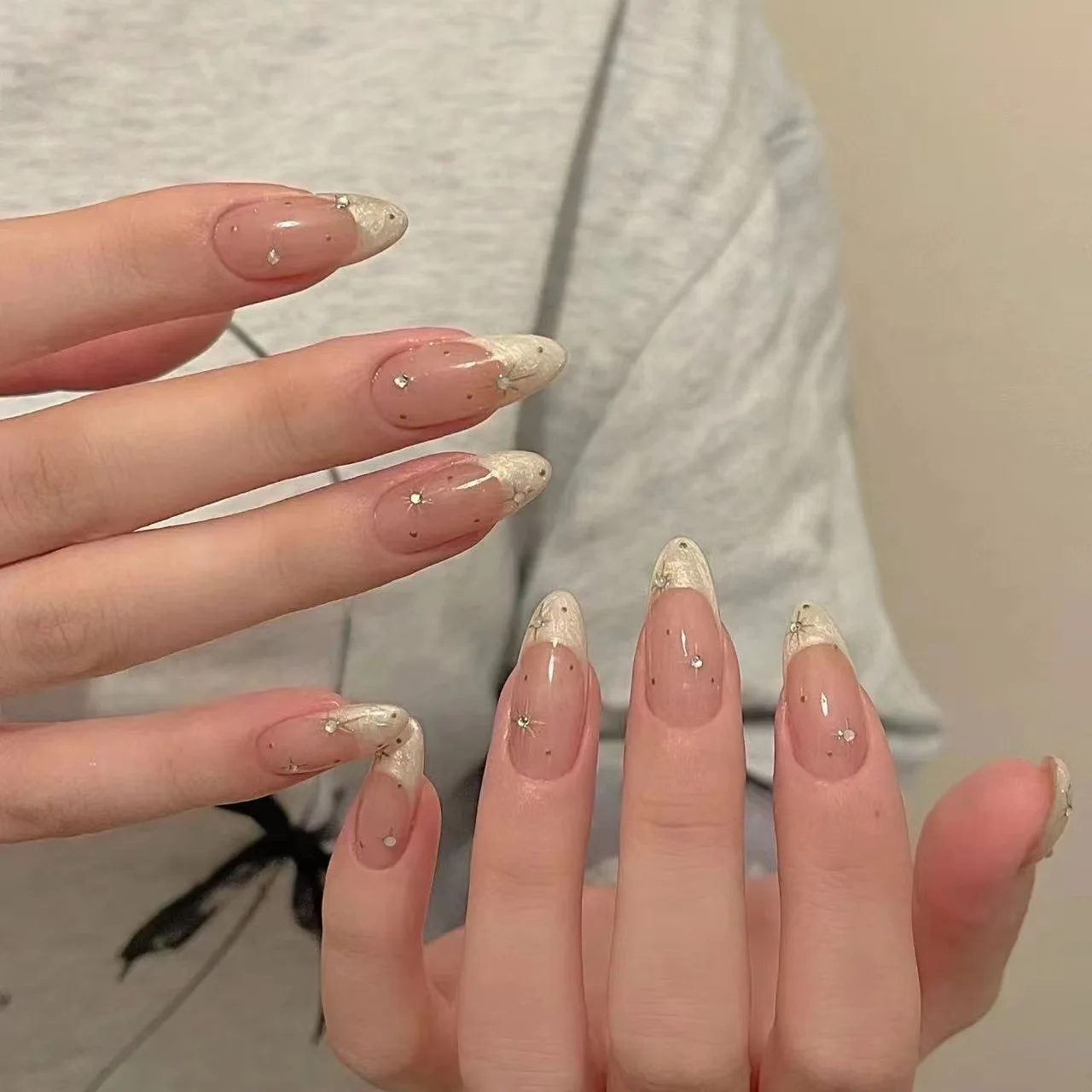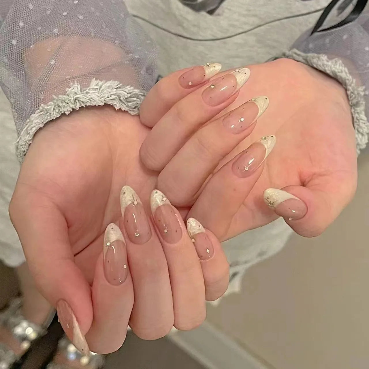 Qfdian 10Pcs Handmade Press on Nails Full Cover Rhinestone Decoration French Almond Ballet Artificial False Nails Manicure Nail Tip
