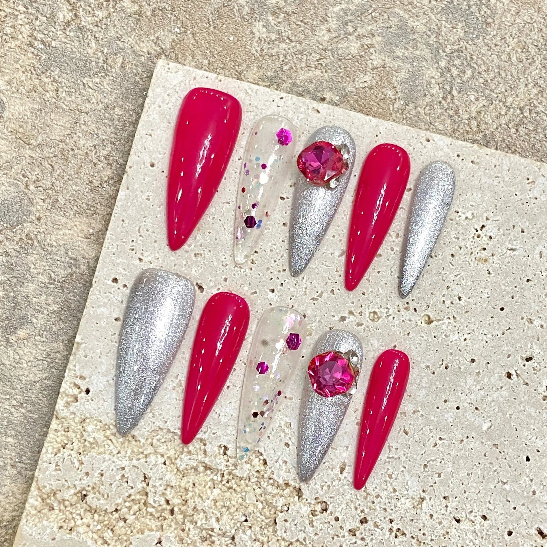 10PCS Handmade Rose Red Almond Fake Nails Diamond Decor Wearable Long Ballet False Nails Shiny Sequin Press On Nail Tips