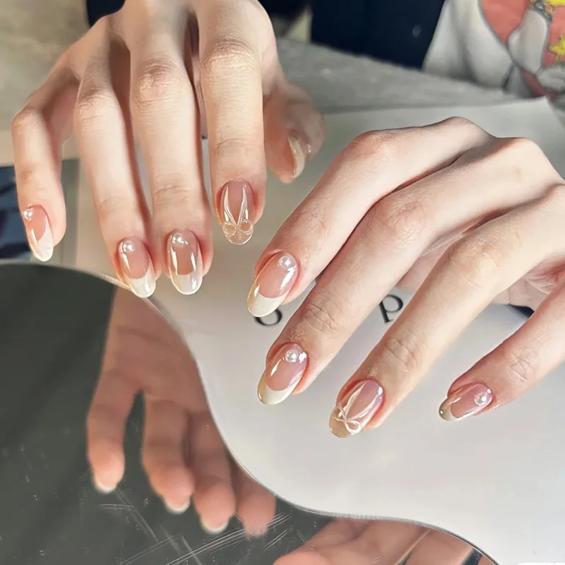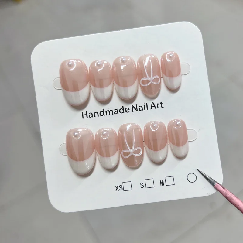Qfdian 10Pcs Handmade Short Oval Press on Nails French White Pink Bow Pearls Cute False Nails Reusable Wearable Nail For Girls Women