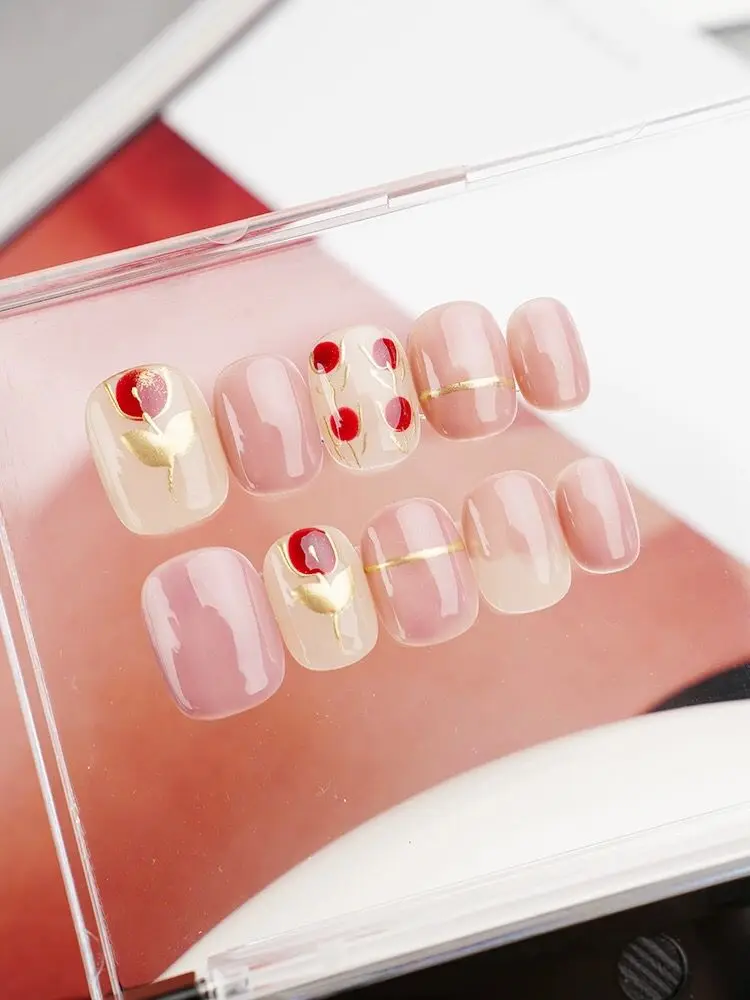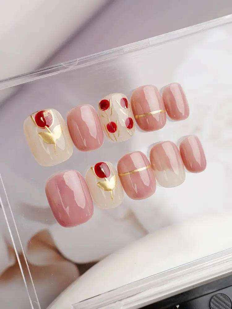 Qfdian 10Pcs Handmade Short Press On Nails Painted Little Rose Sweet Fake Nails Round Head False Nails Gentle for Girl Manicure Salon
