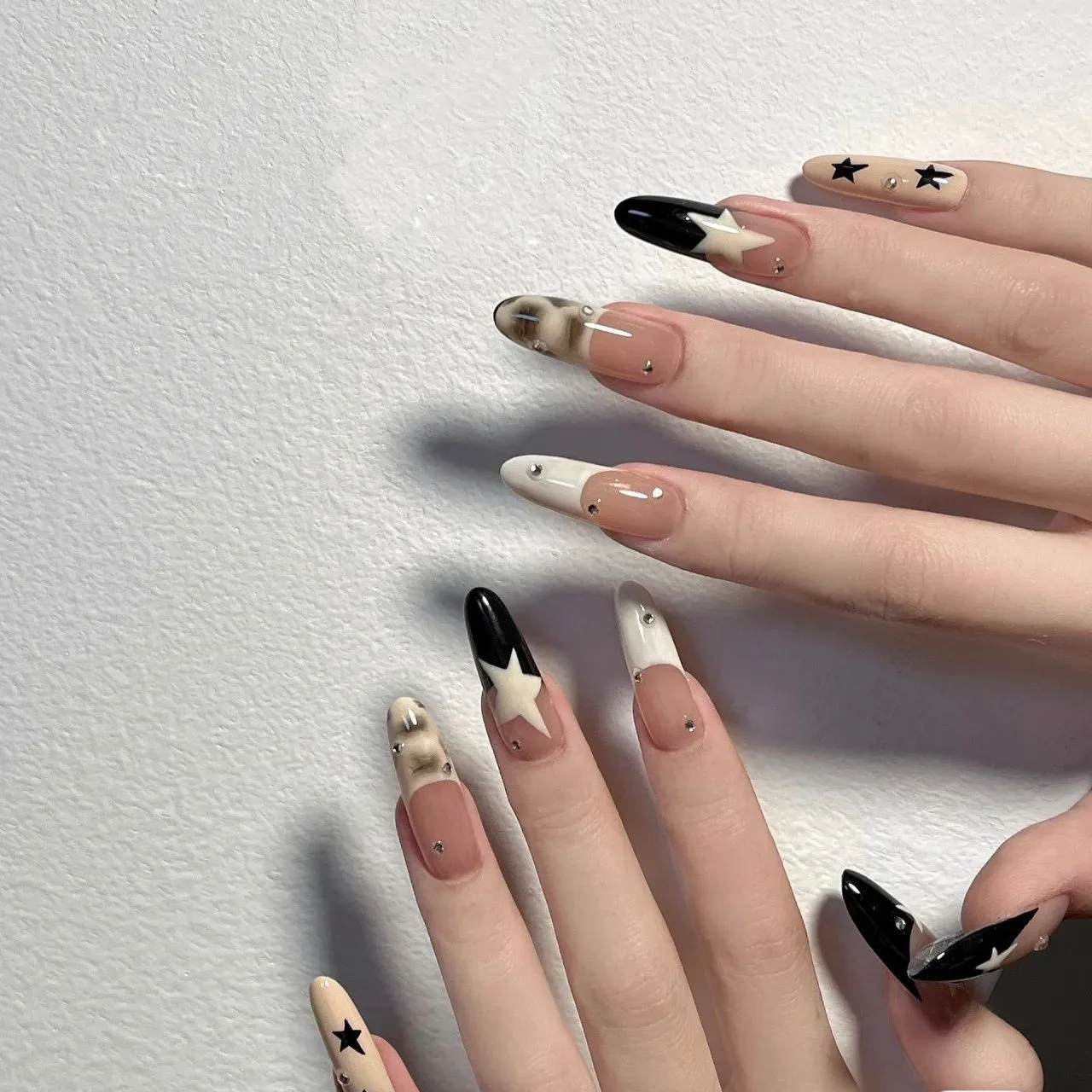 Qfdian 10pcs Handmade Star Long French False Nails Press on Nails Fake Nials Reusable Wearable Nail Tips Artificial False Nails