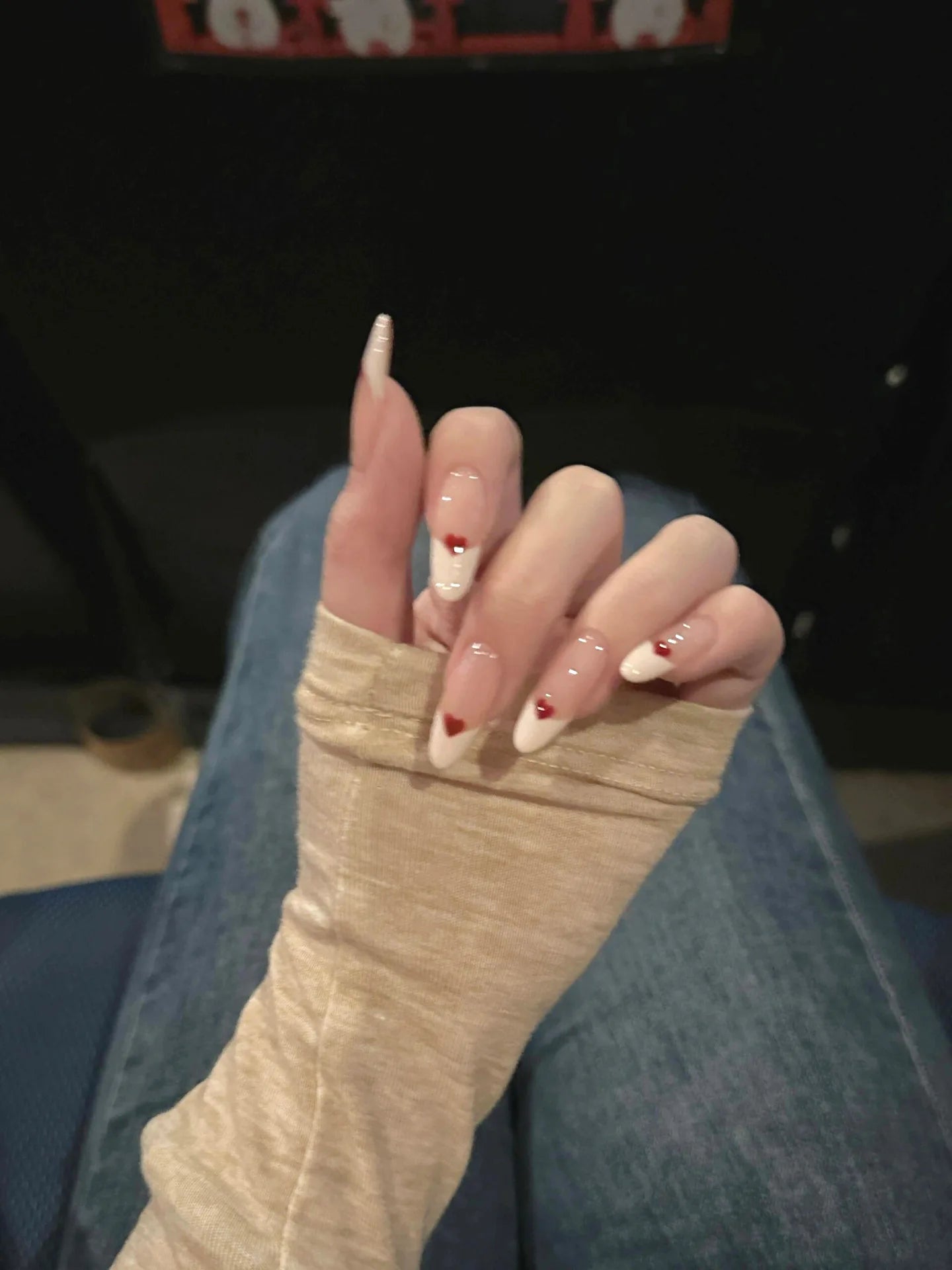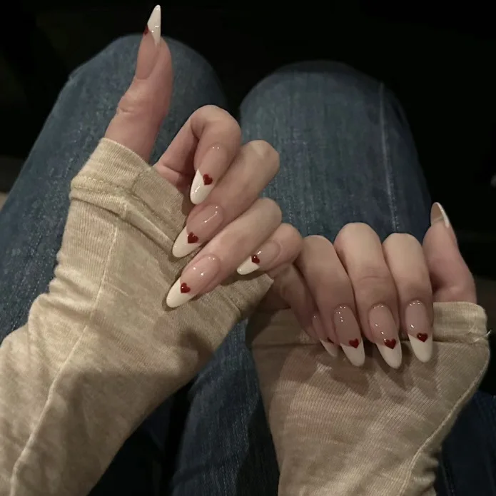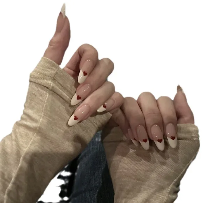 Qfdian 10Pcs Handmade Sweet French White Edge Press on Nails Cute Red Heart Decoration Wearable False Reusable Manicure Nails