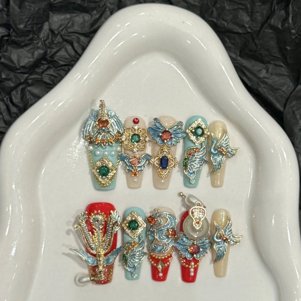 Qfdian 10Pcs High Quality Handmade Press on Nails Carved Retro Lace Rhinestone Full Setting Laser Glitter Stick-on Nail Art Retro Briti