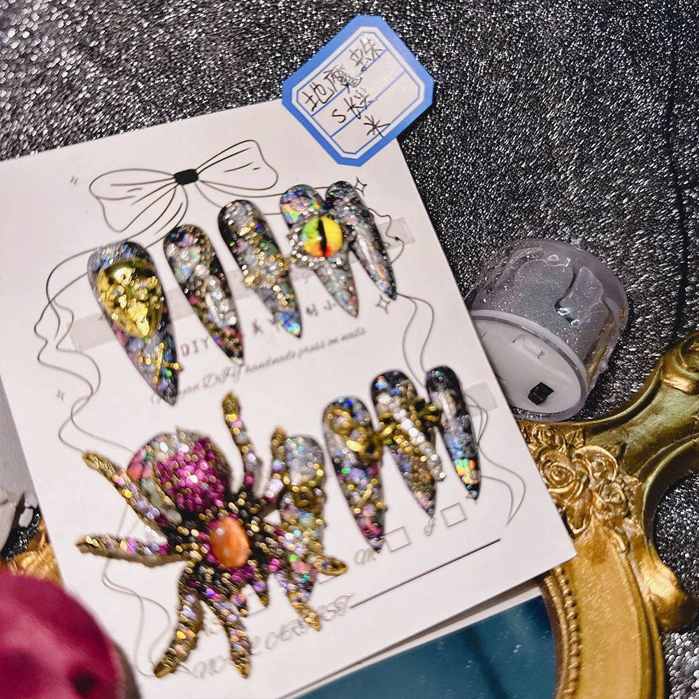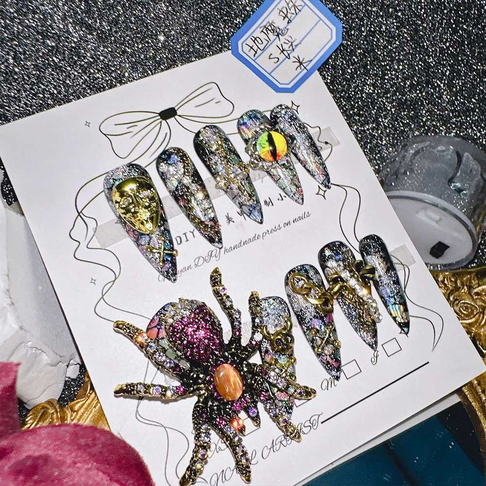 Qfdian 10Pcs High Quality Handmade Press on Nails Earth Demon Spider Dark Super Flash Exaggerated Spider Spicy Girl Personality Gothic