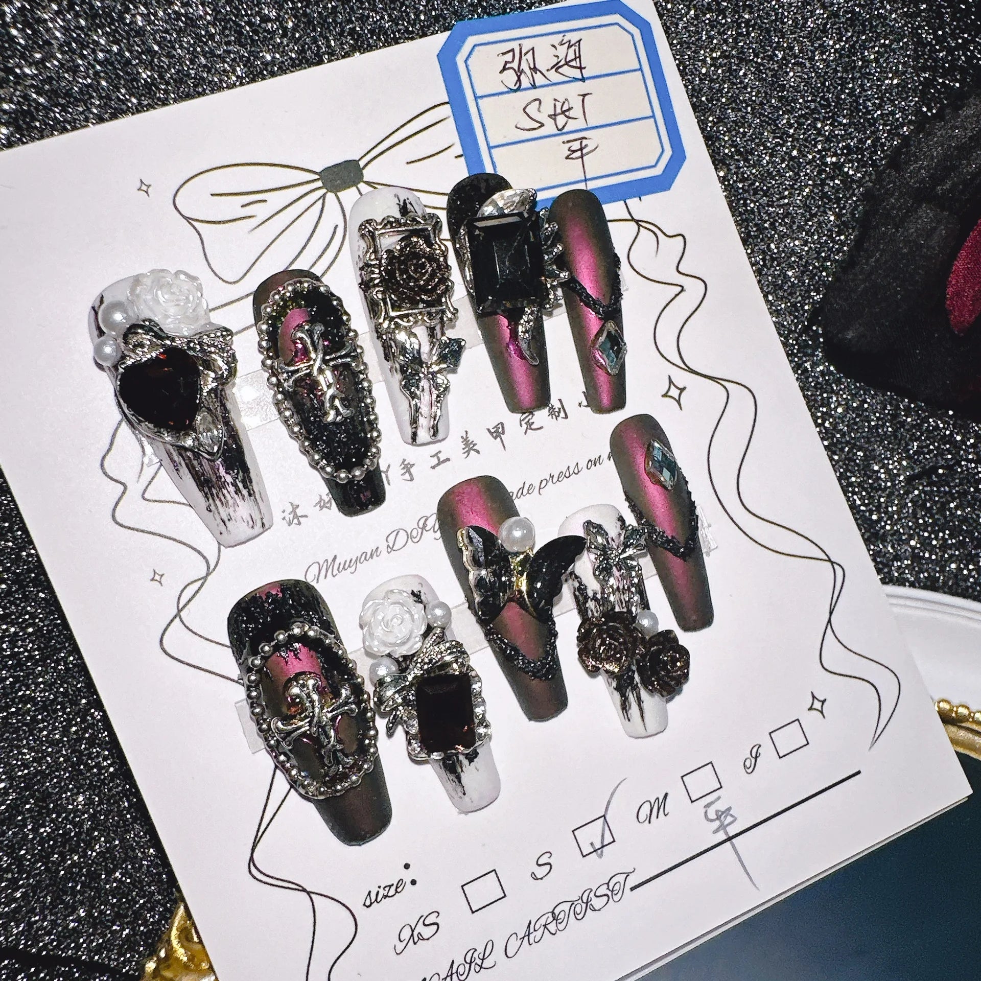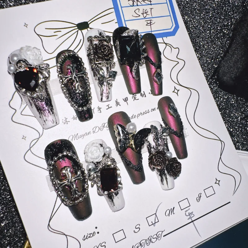 Qfdian 10Pcs High Quality Handmade Press on Nails Mihai Matte Darkening Niche Style Spicy Girl Nail Drill Decoration