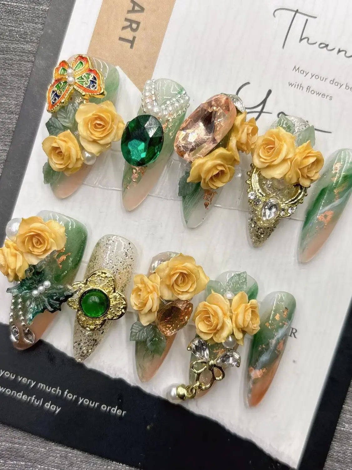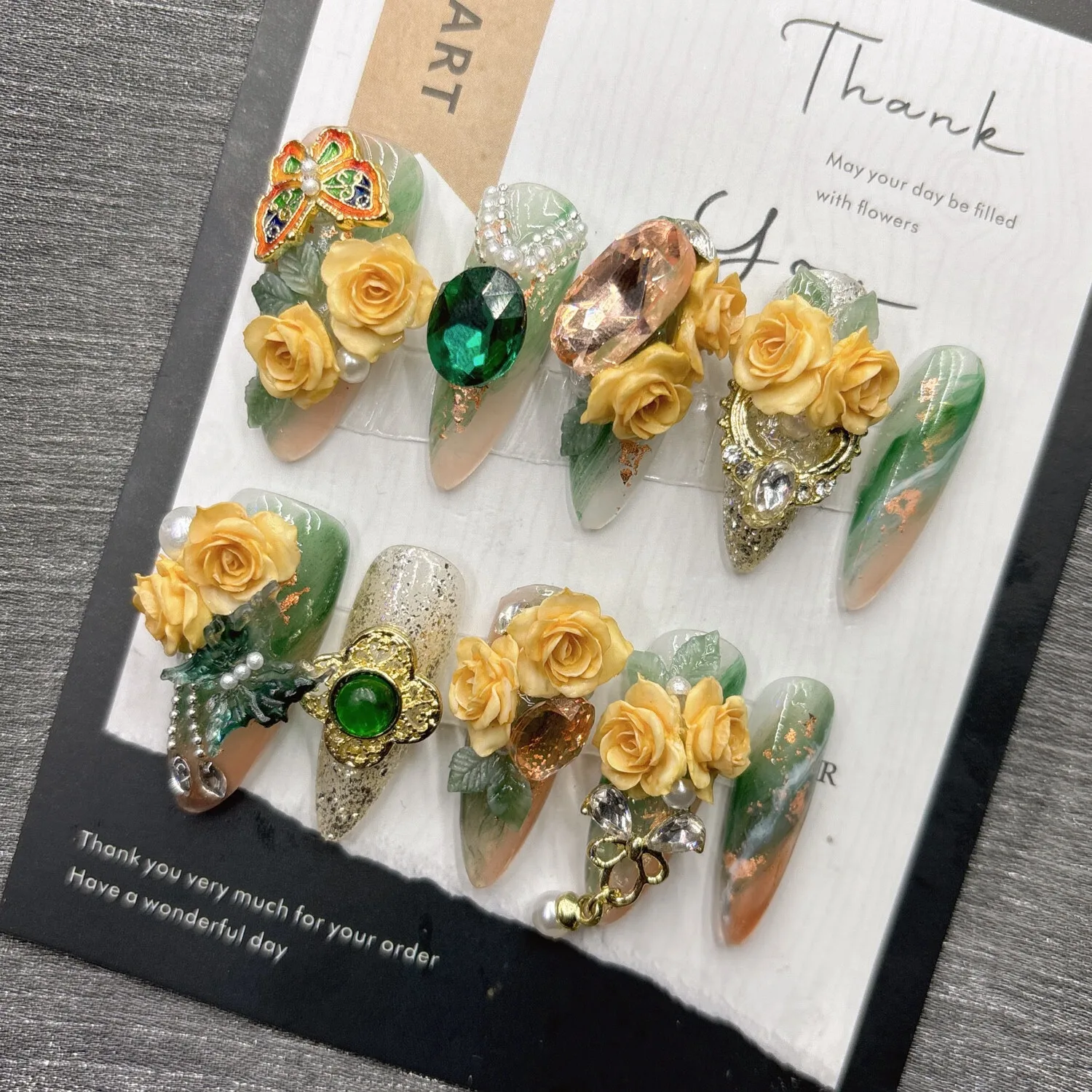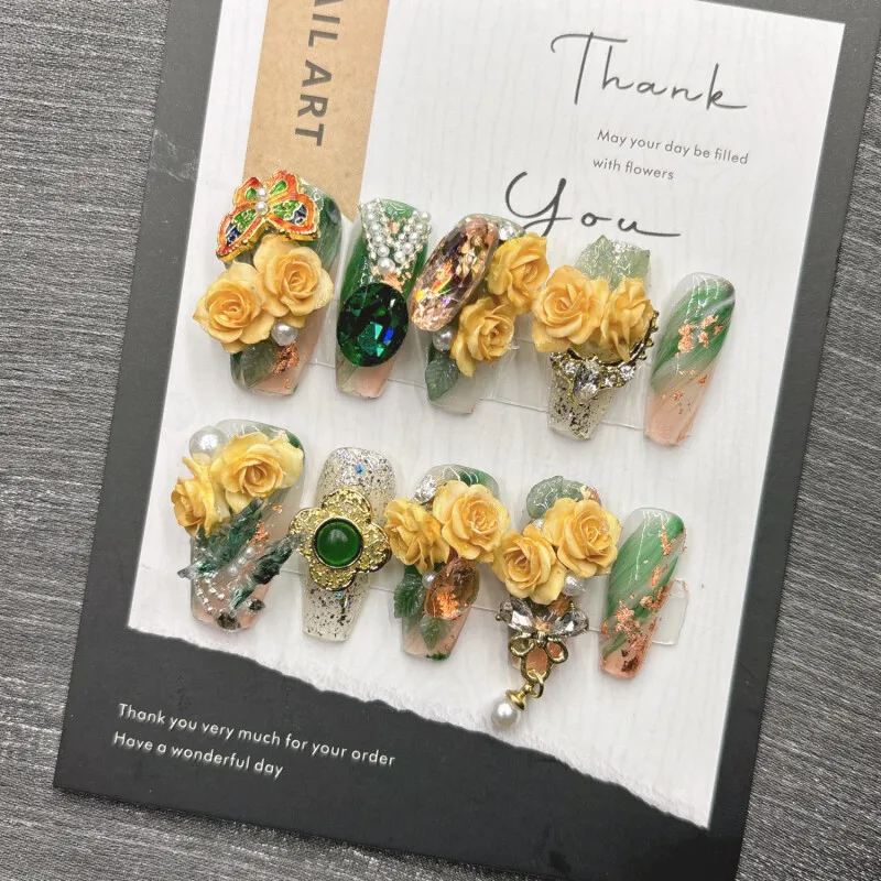 Qfdian 10Pcs High Quality Handmade Press on Nails Palace Retro Style Yellow Carved Emerald Pure Handmade Medium Long Style