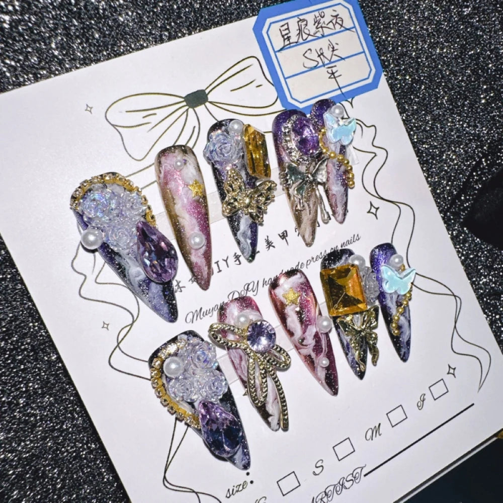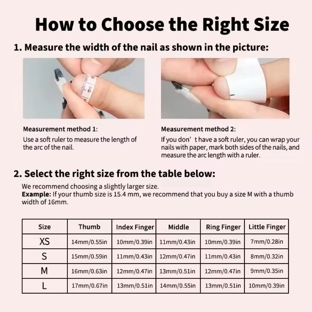 Firstly, when choosing to wear pressure nails, size must be the first choice, because wearing pressure nails is a finished product, and the seller does not know the size of your nail plate, so each person's pressure nail size is different. Generally speaking, there are four main types of nail sizes on the market. The XS/S/M/L four sizes are suitable for the vast majority of people.
