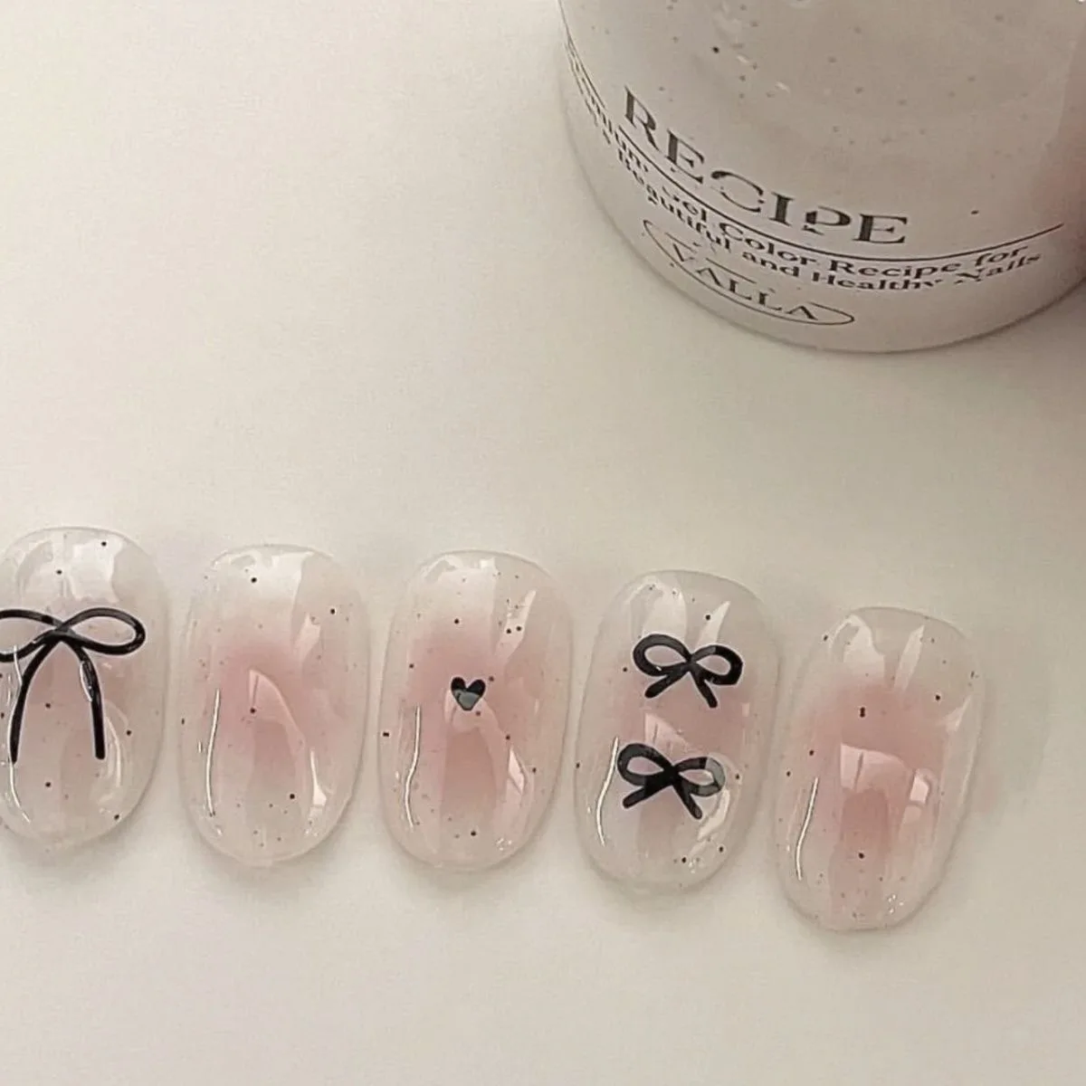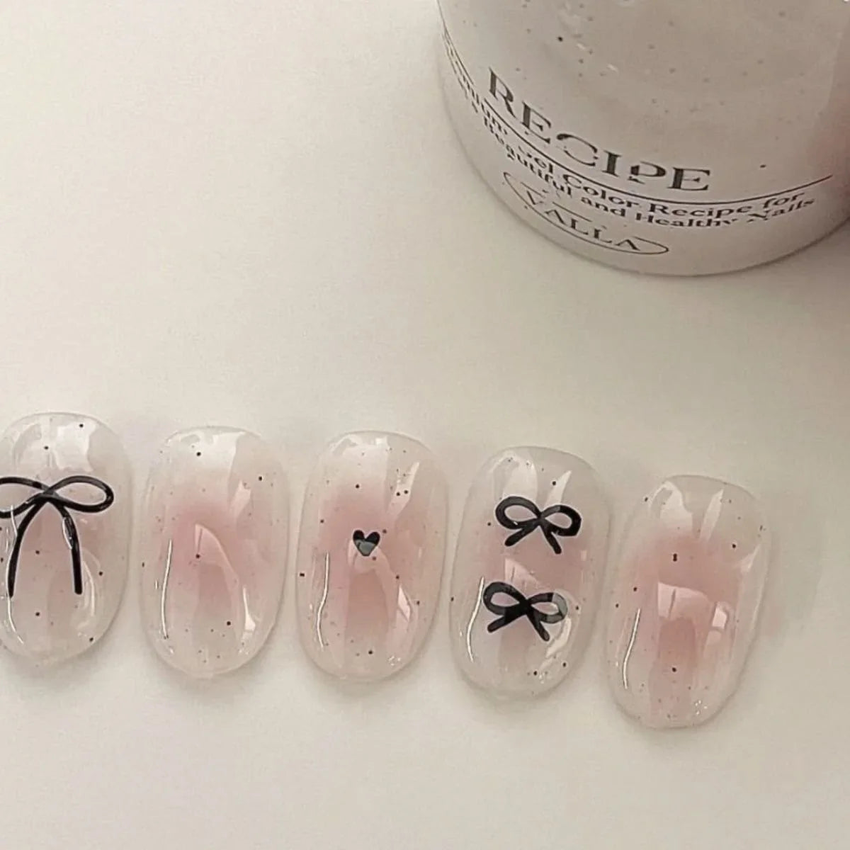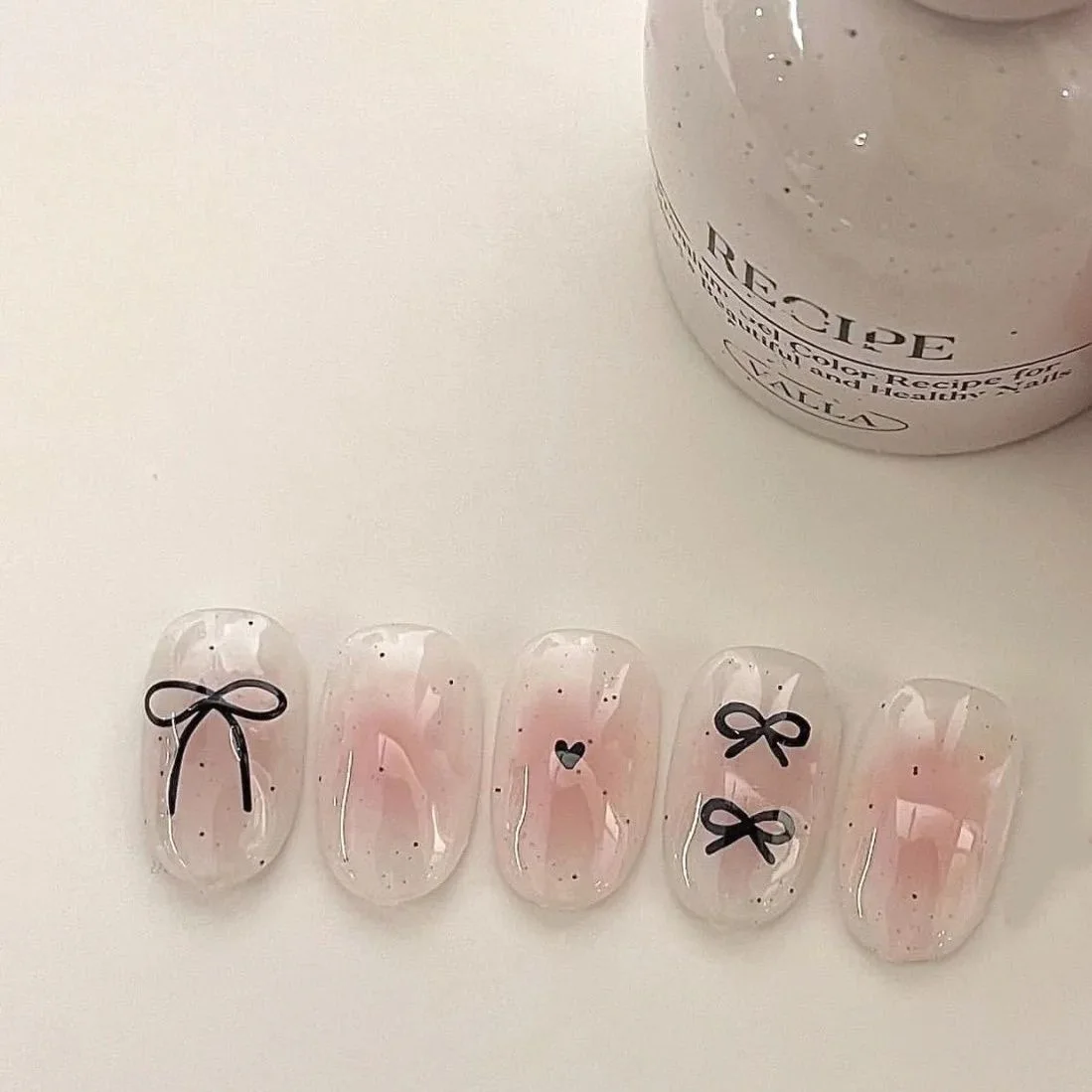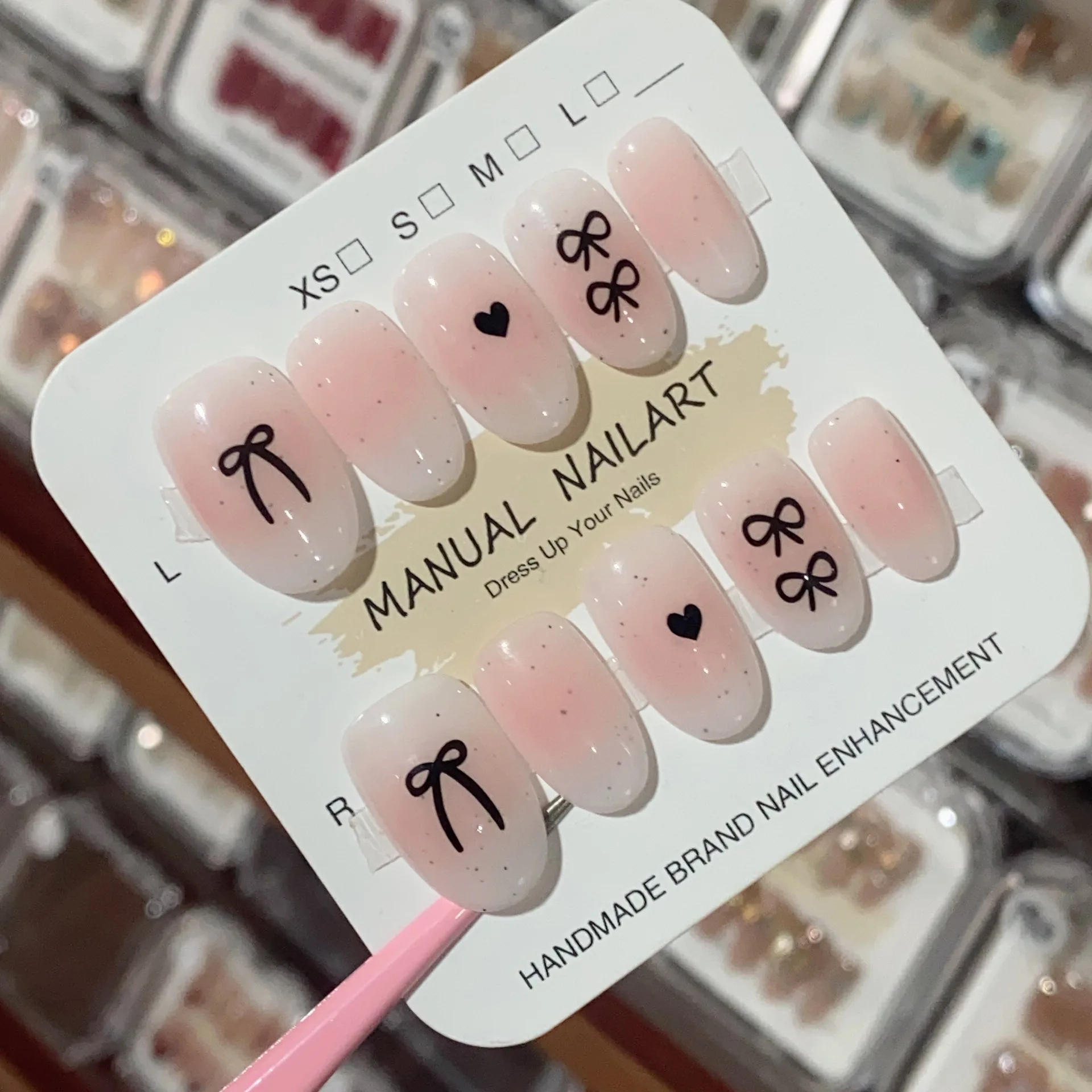 10Pcs Pink Handmade Press on Nails Short Blush Artificial False Nail Tips Black Bow Designed Sweet Girl Full Cover Fingernail