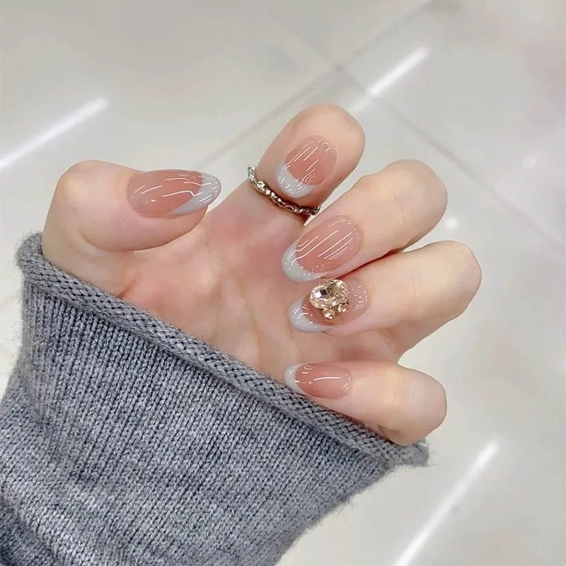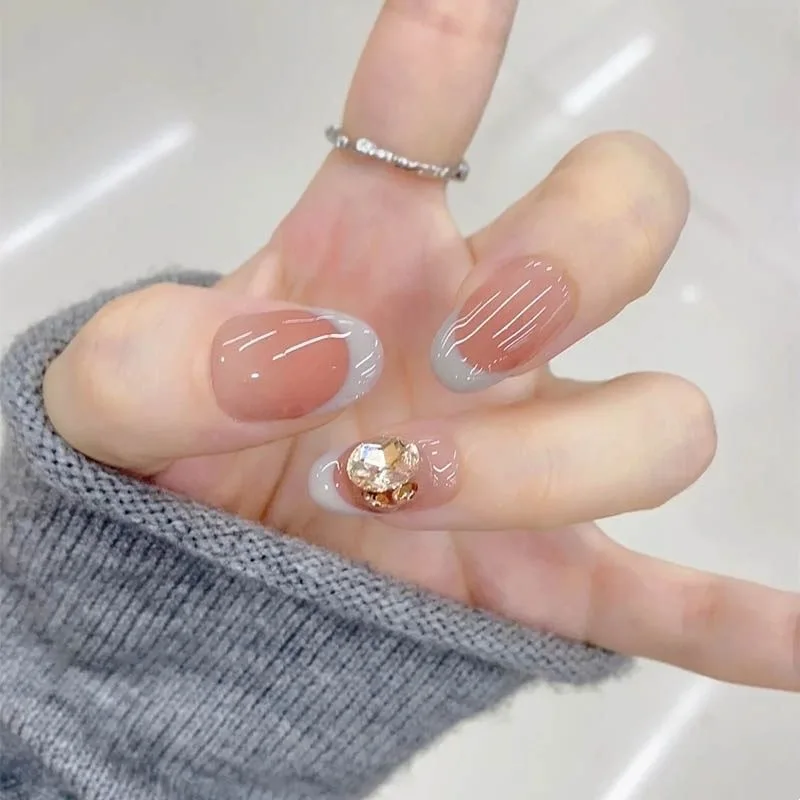 Qfdian 10Pcs Short Oval French Pink Blue Handmade Press on Nails Fake Nails With 3D Diamond Design Wearable Nail Tips Art