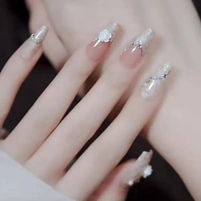 Qfdian 10Pcs White French Design Handmade Press On Nails with Flower Wearable False Nails Full Cover Fake Nails Tips Artificial Manicur