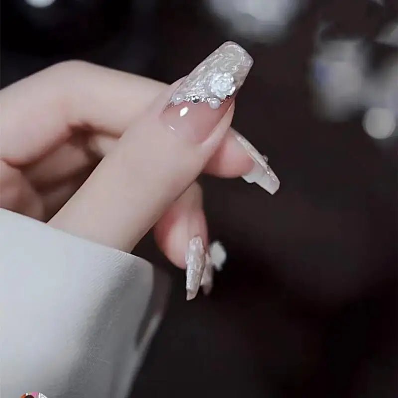 10Pcs White French Design Handmade Press On Nails with Flower Wearable False Nails Full Cover Fake Nails Tips Artificial Manicur