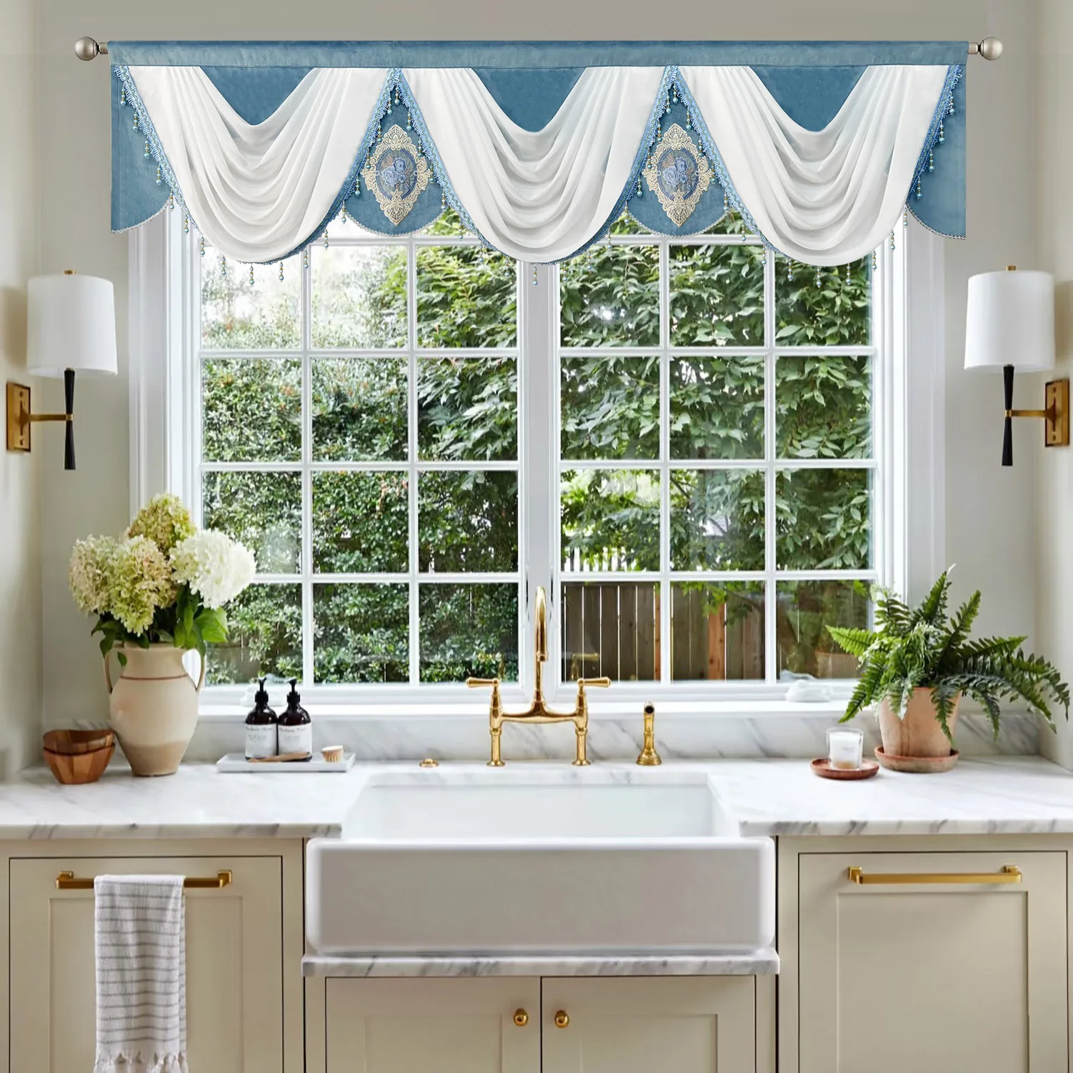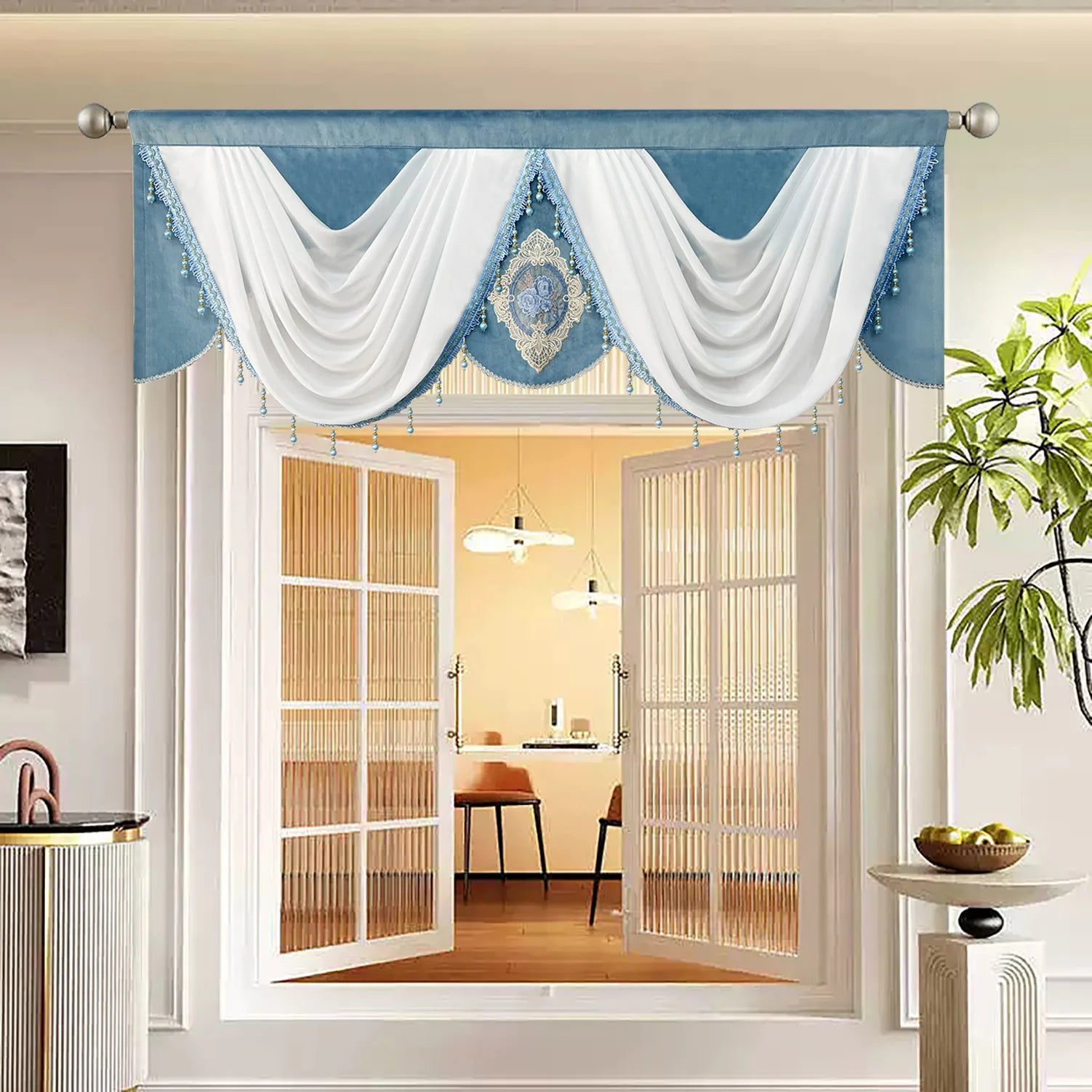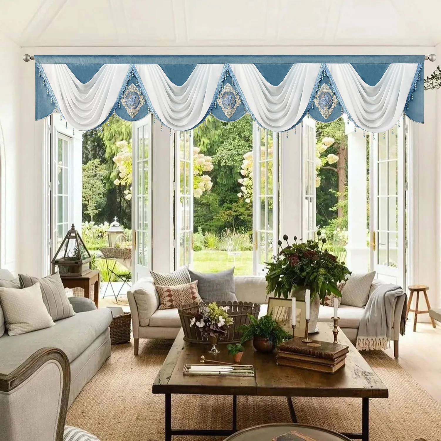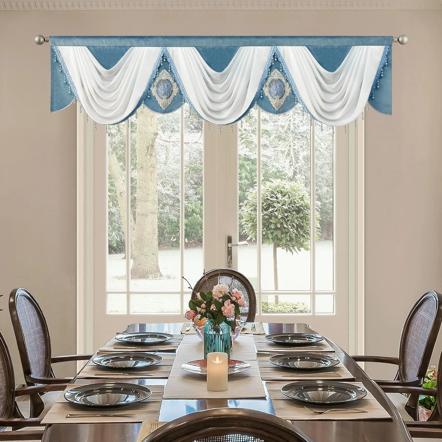 Qfdian 1Pc,Blue and White Luxury Waterfall Valance Curtain Hanging for Luxury Window Thick Swag with Pendant Beads Window Bedroom Decor
