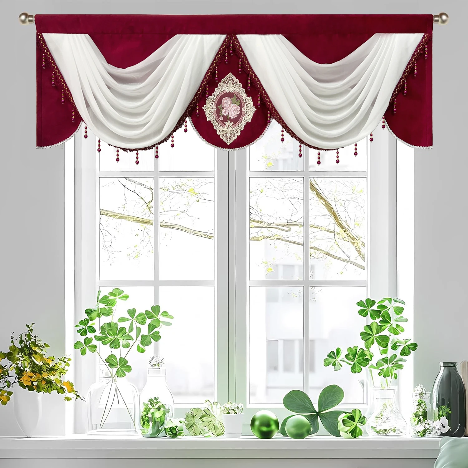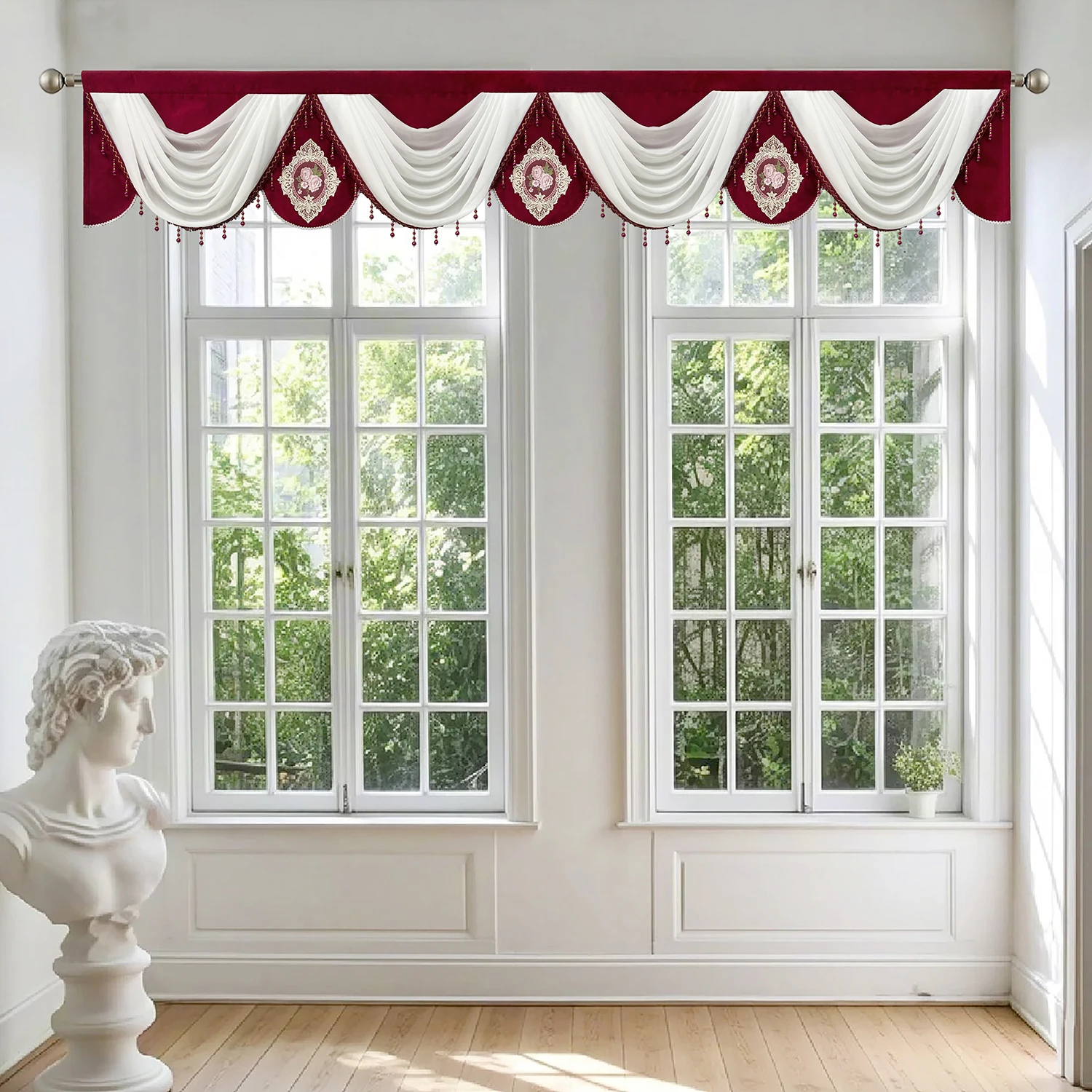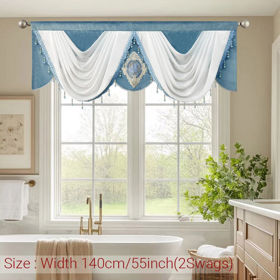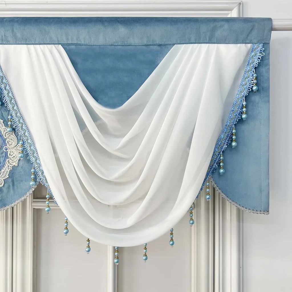 Qfdian 1Pc,Blue and White Luxury Waterfall Valance Curtain Hanging for Luxury Window Thick Swag with Pendant Beads Window Bedroom Decor