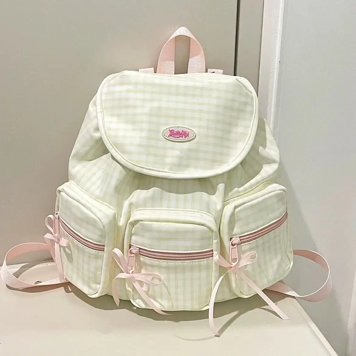 Qfdian 2025 New Casual Plaid Girls Backpack Women Students Fashion Chic Bow Backpacks Streetwear Ins Kawaii All Match Schoolbags Trendy