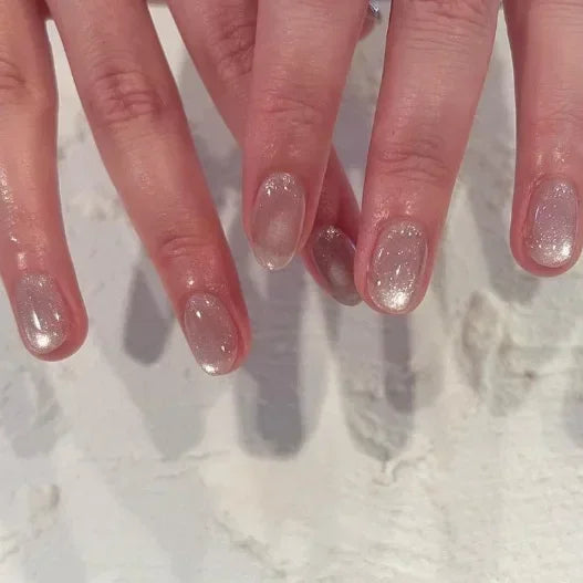 24Pcs Simple False Nails with Glue Short Almond Fake Nails Glitter Aurora Round Head Full Cover Nail Tips Oval Press on Nails