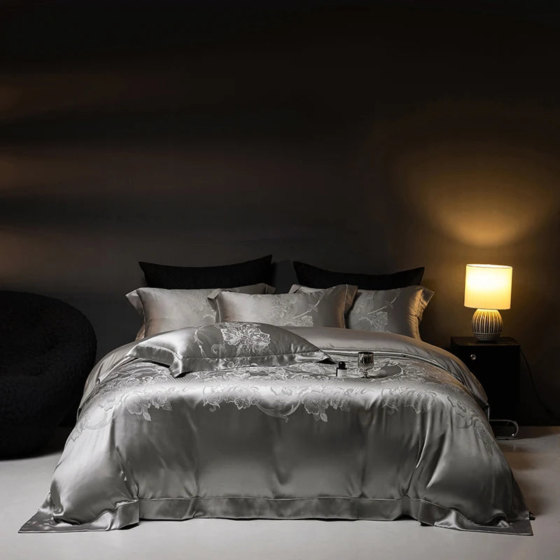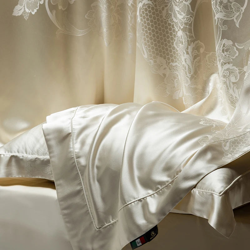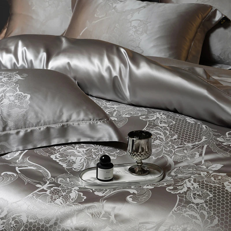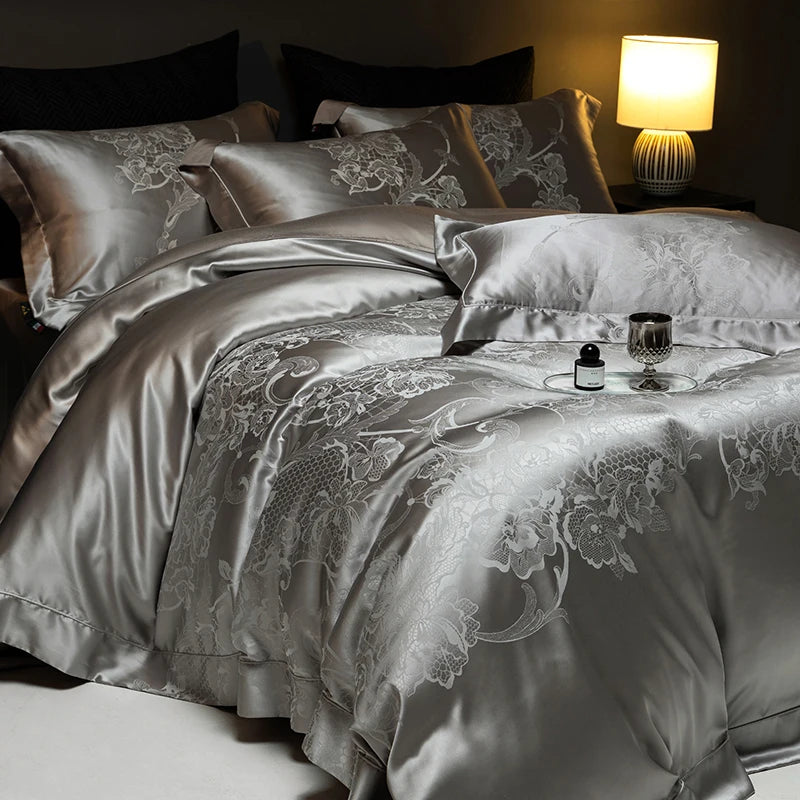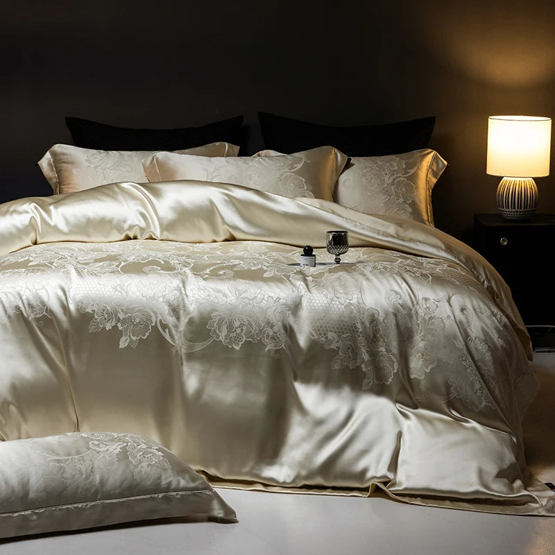 Qfdian 4Pcs Champagne Silk Damask Jacquard Egyptian Cotton Patchwork Luxury Bedding Set Duvet Cover Flat/Fitted Bed Sheet Pillowcases