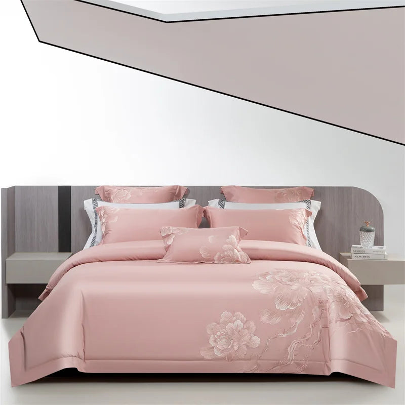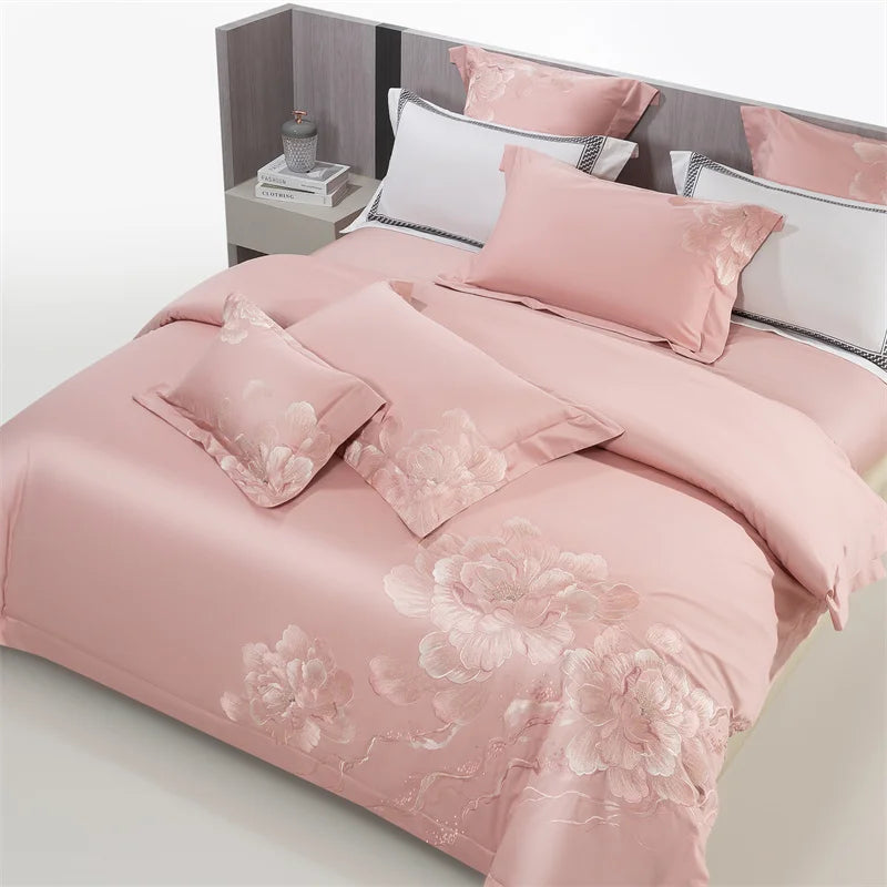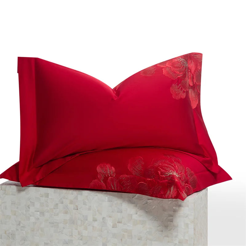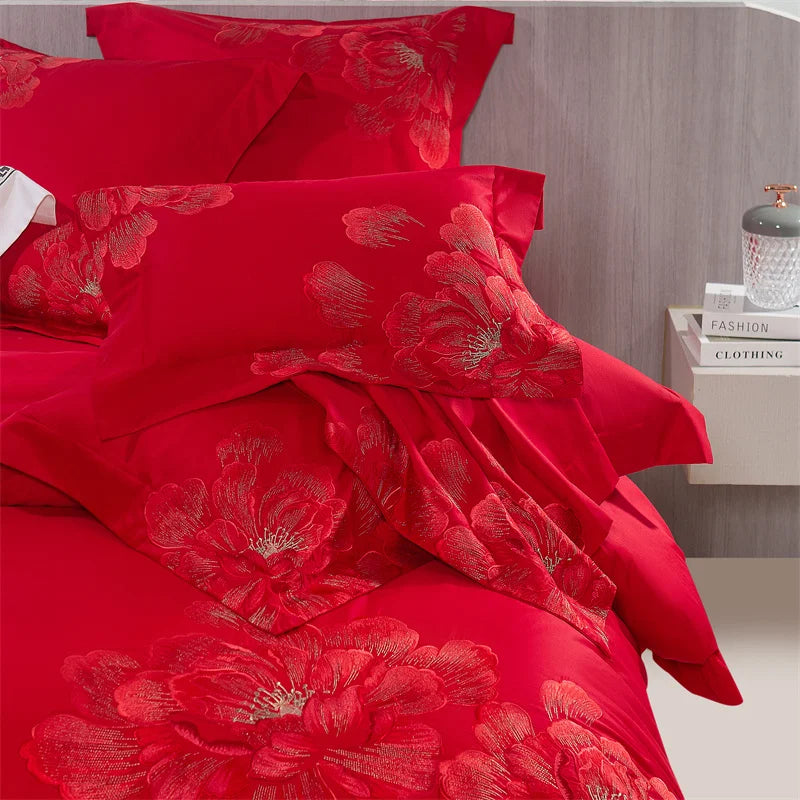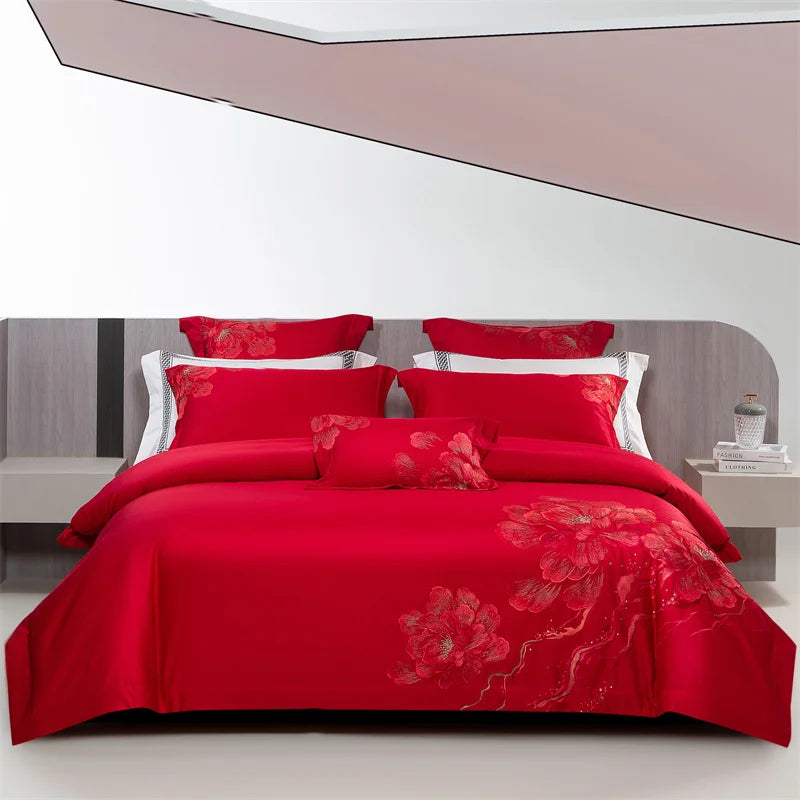 Qfdian 4Pcs Luxury Flowers Embroidery 1400TC Egyptian Cotton Red Wedding Bedding Set Duvet Cover Set Flat/Fitted Bed Sheet Pillowcases