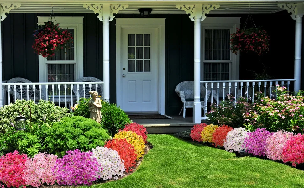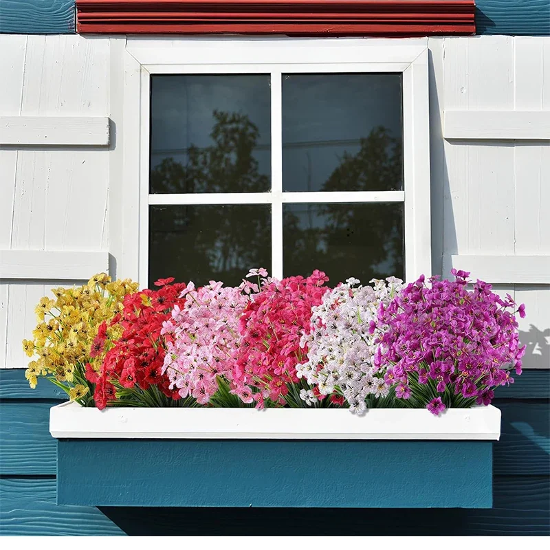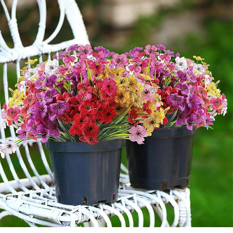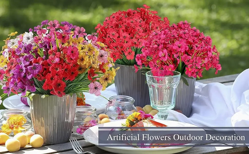 Perfect for Outdoor/Indoor - Plastic flowers are ideal for outdoor porches,walkway,terraces windox box,front yard,pots,hanging planters,gardens,landscape,windowsills,allow you have beautiful color all year around.Also suit for birthdays,weddings,memorial place or grave,they can live anywhere and have withstood heavy rain storms and winds.