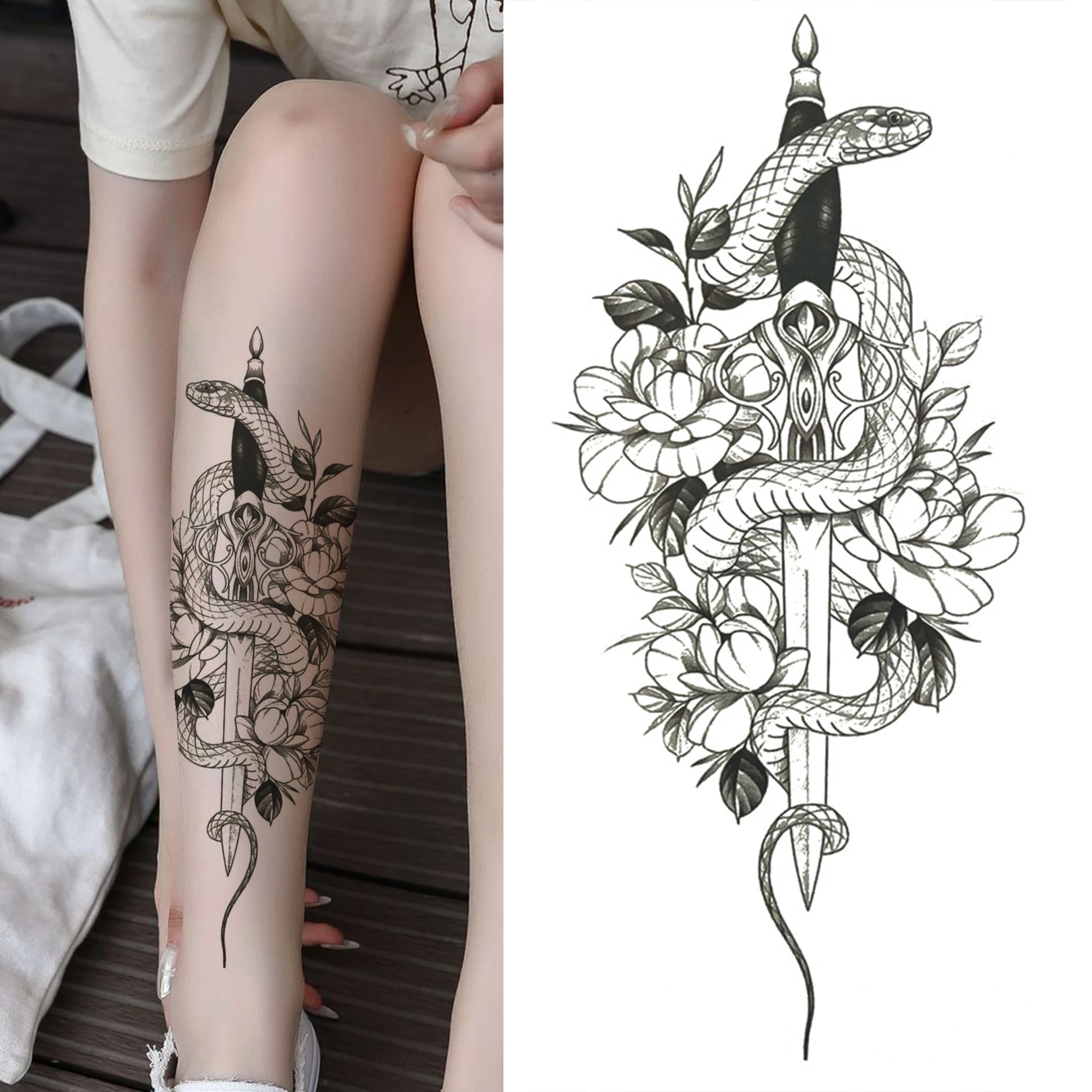 Qfdian Black Sexy Flower Waterproof Temporary Tattoos Sticker Rose Snake Lion Women Body Arm Painting Realistic Fake Tattoo
