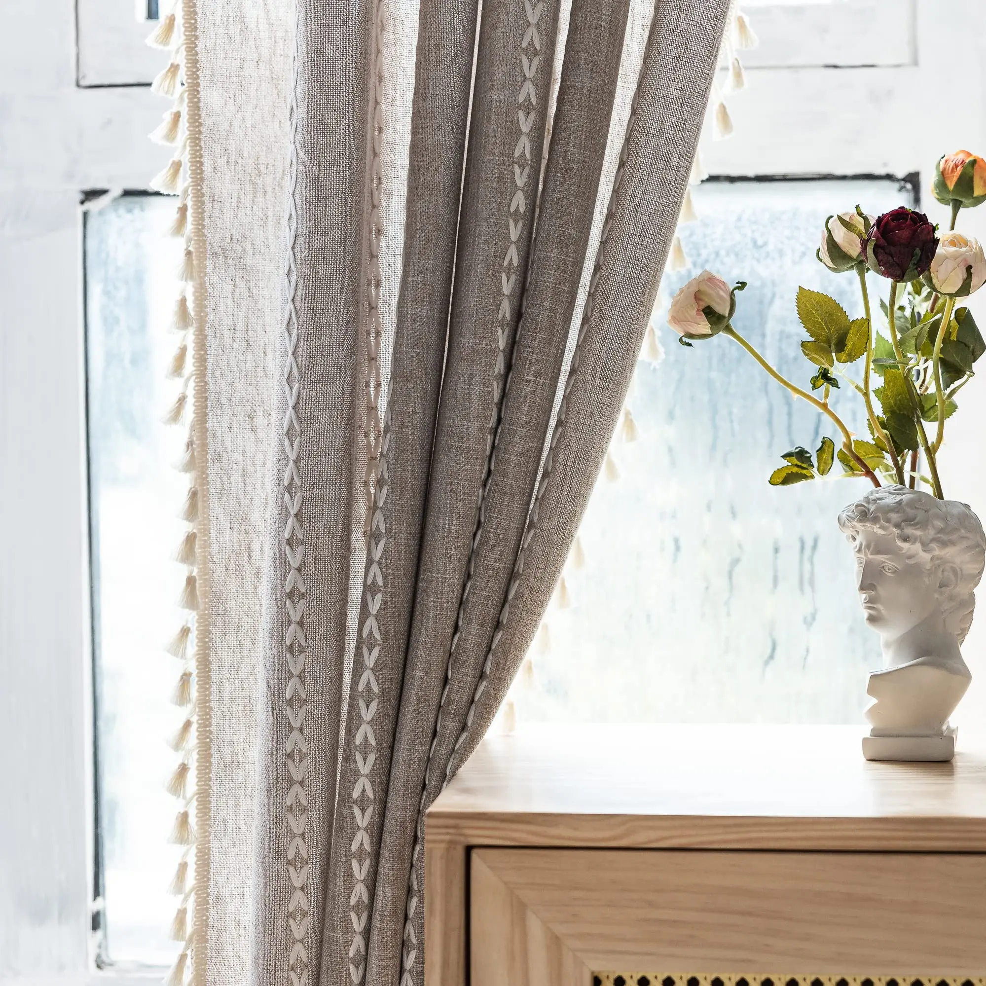 Qfdian Boho Curtain for Bedroom, Cotton Linen Stripes Embroidery, Semi Blackout Bohemian Retro Window Treatment Drape Tassels 1 Panel