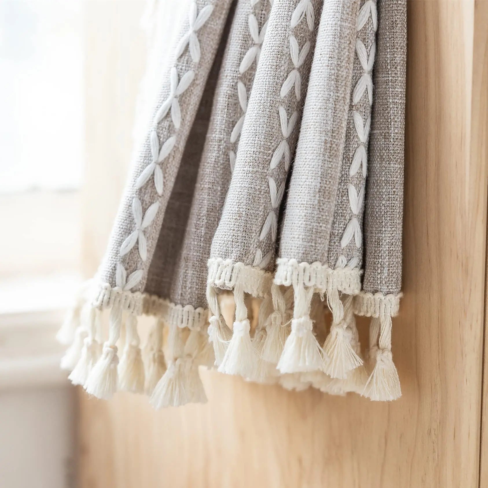 【BOHO CHIC DESIGN】Featuring elegant white stripes embroidery and shabby chic hollow geometric patterns decoring on the natural color cotton linen fabric. Both sided and bottom edges sewed along with beautiful handmade tassels . This bohemian style window treatment panel definitely increase the charm of any room.