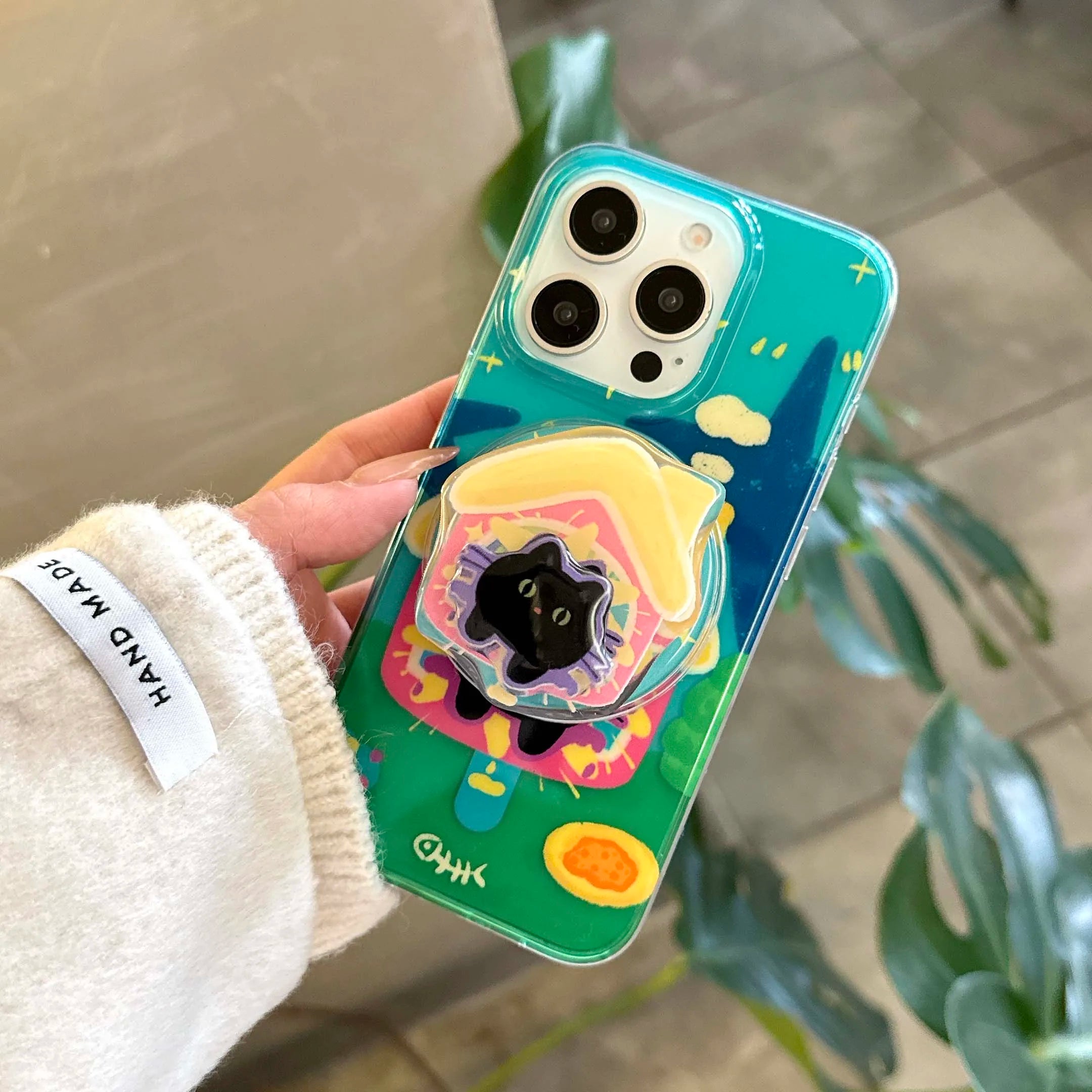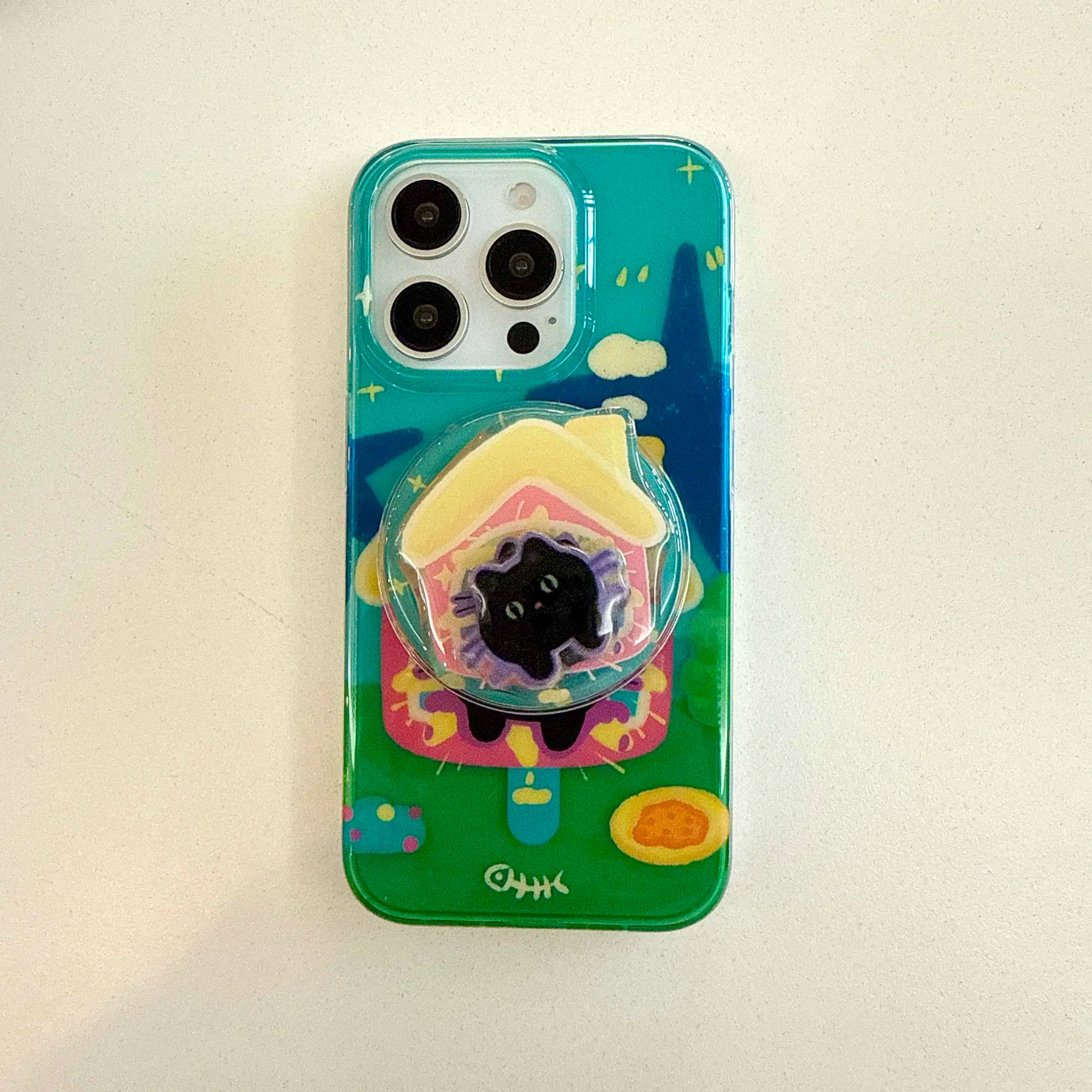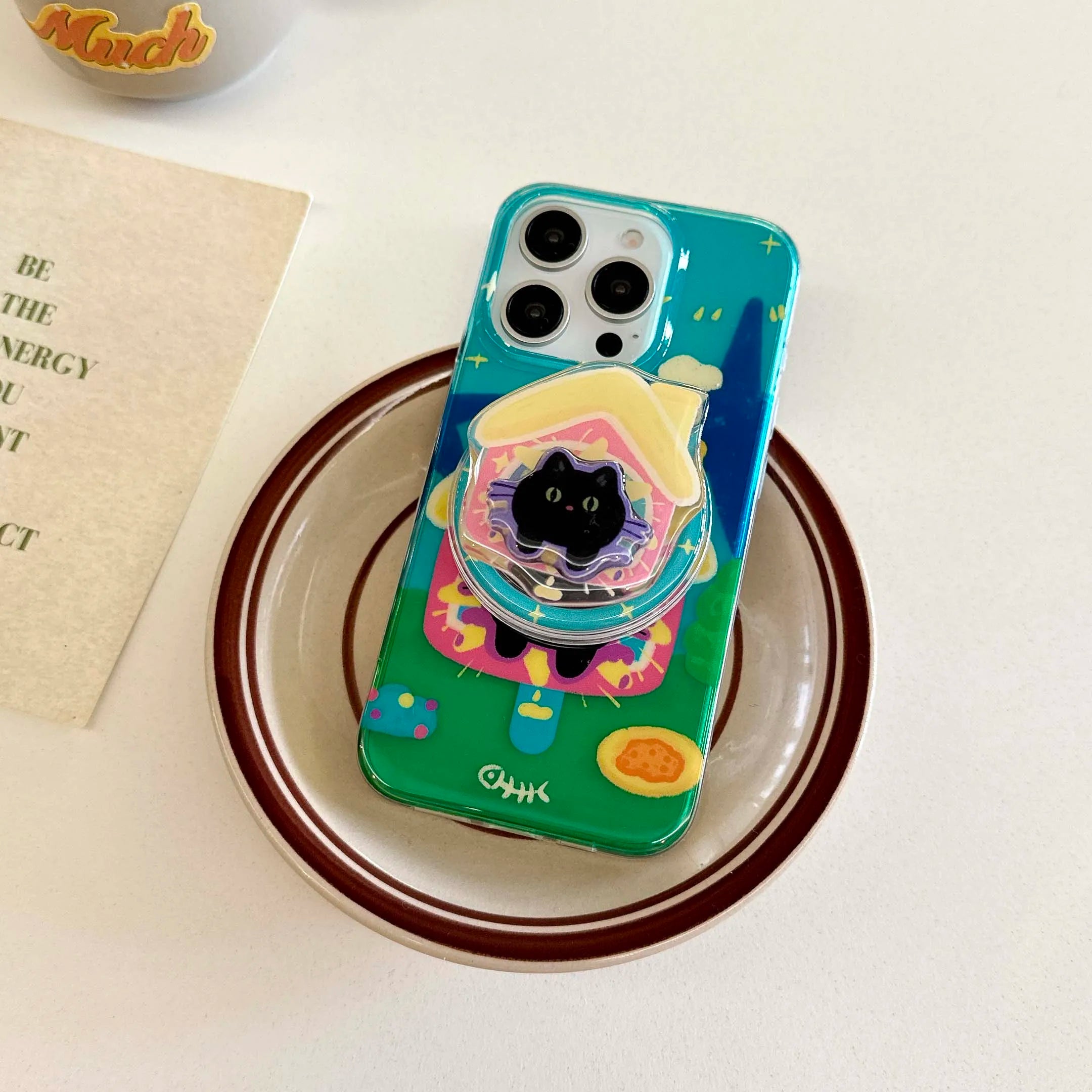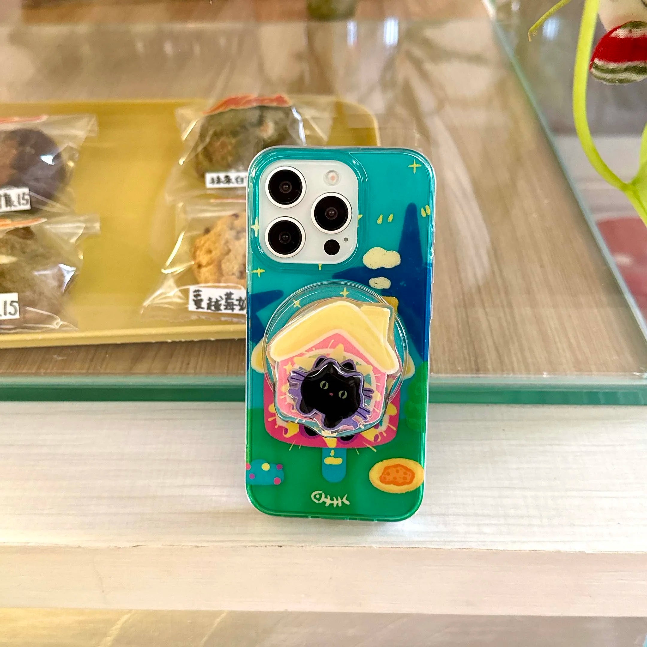 Qfdian Cartoon black cat house magnetic stand holder cute shell for iphone 14promax 15pro 16 14 13 15 pro max 13pro 16pro  phone case