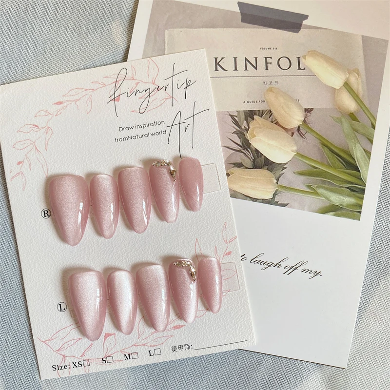 Qfdian Cat's Eye Handmade Fake Nails Press on Rose Gold Pink Manicure Wearable False Nails Full Cover Cute Almond Finger Tips for Woman