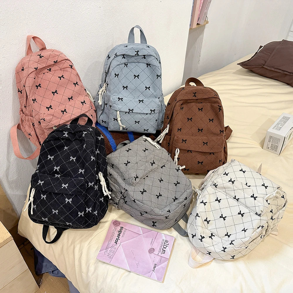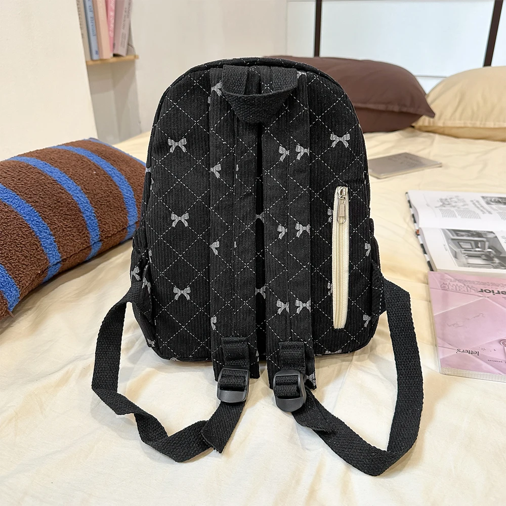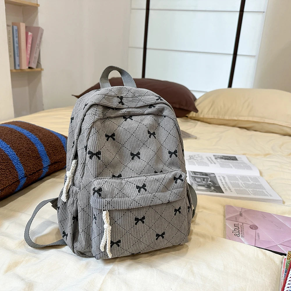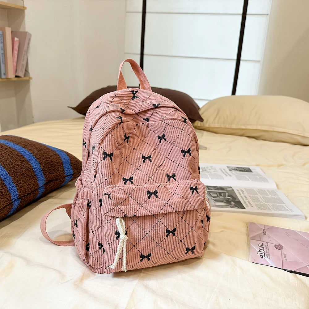 Corduroy small backpack for girls, fashionable and versatile, cute bow tie small backpack, simple backpack