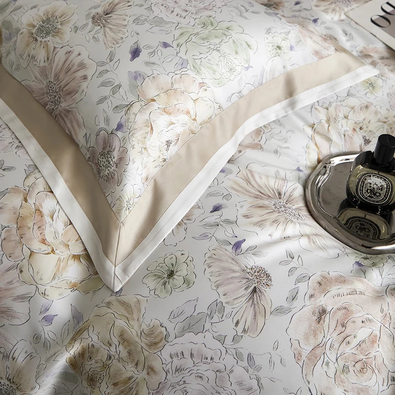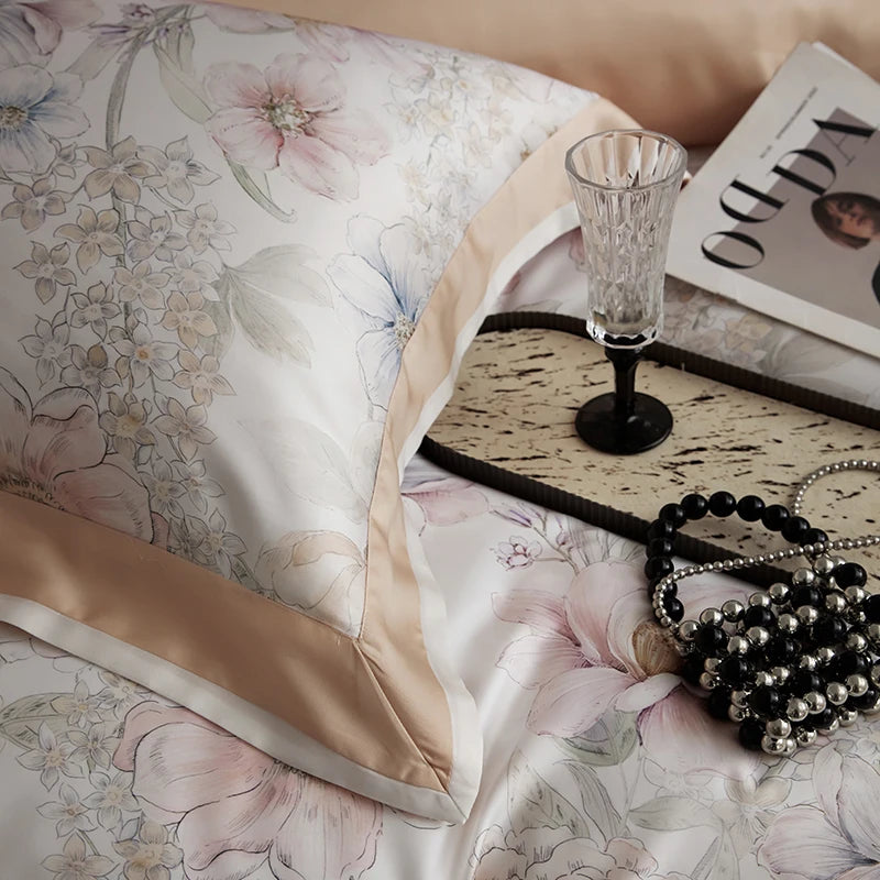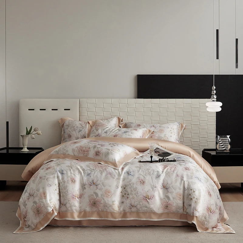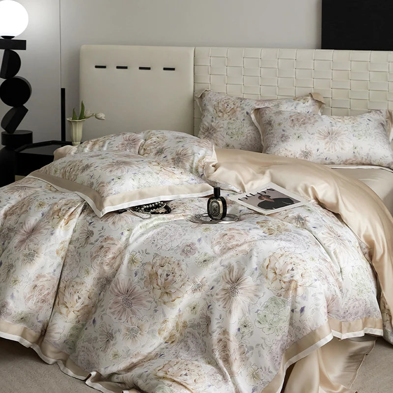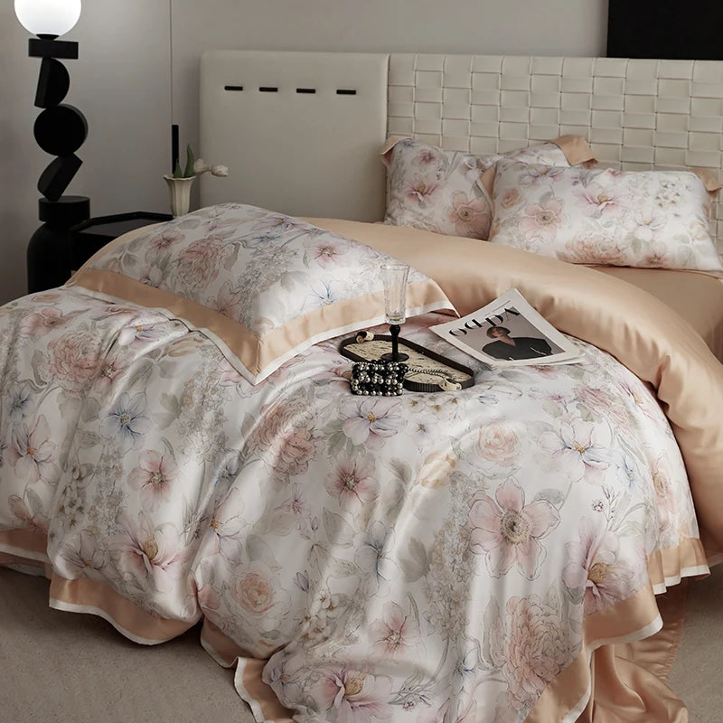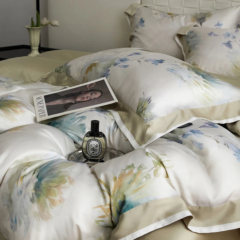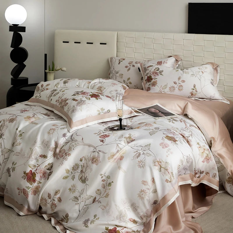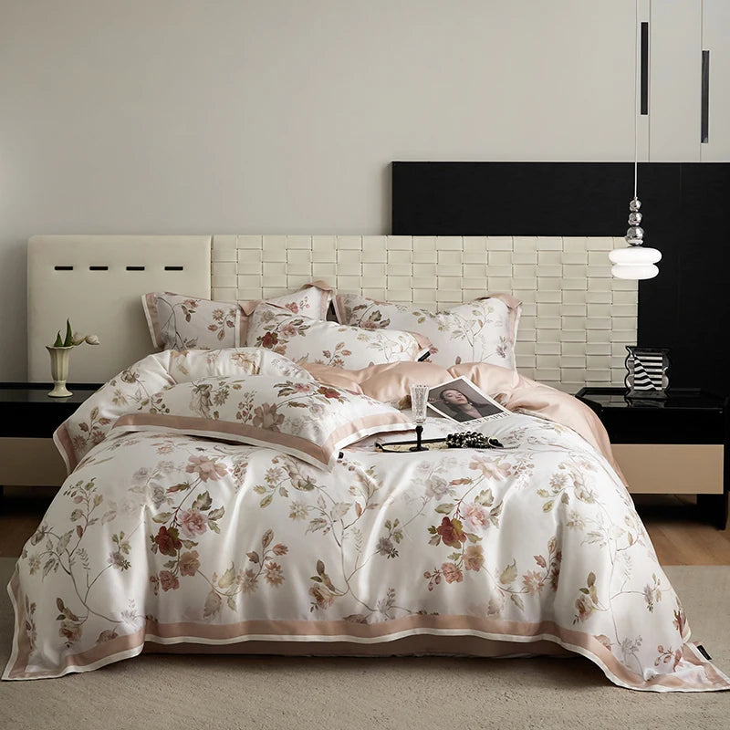 Qfdian Floral Plant Print Color Blocking Bedding Set Lyocell Bamboo Fiber Soft Silky Duvet Cover Flat/Fitted Bed Sheet Pillowcases 4Pcs