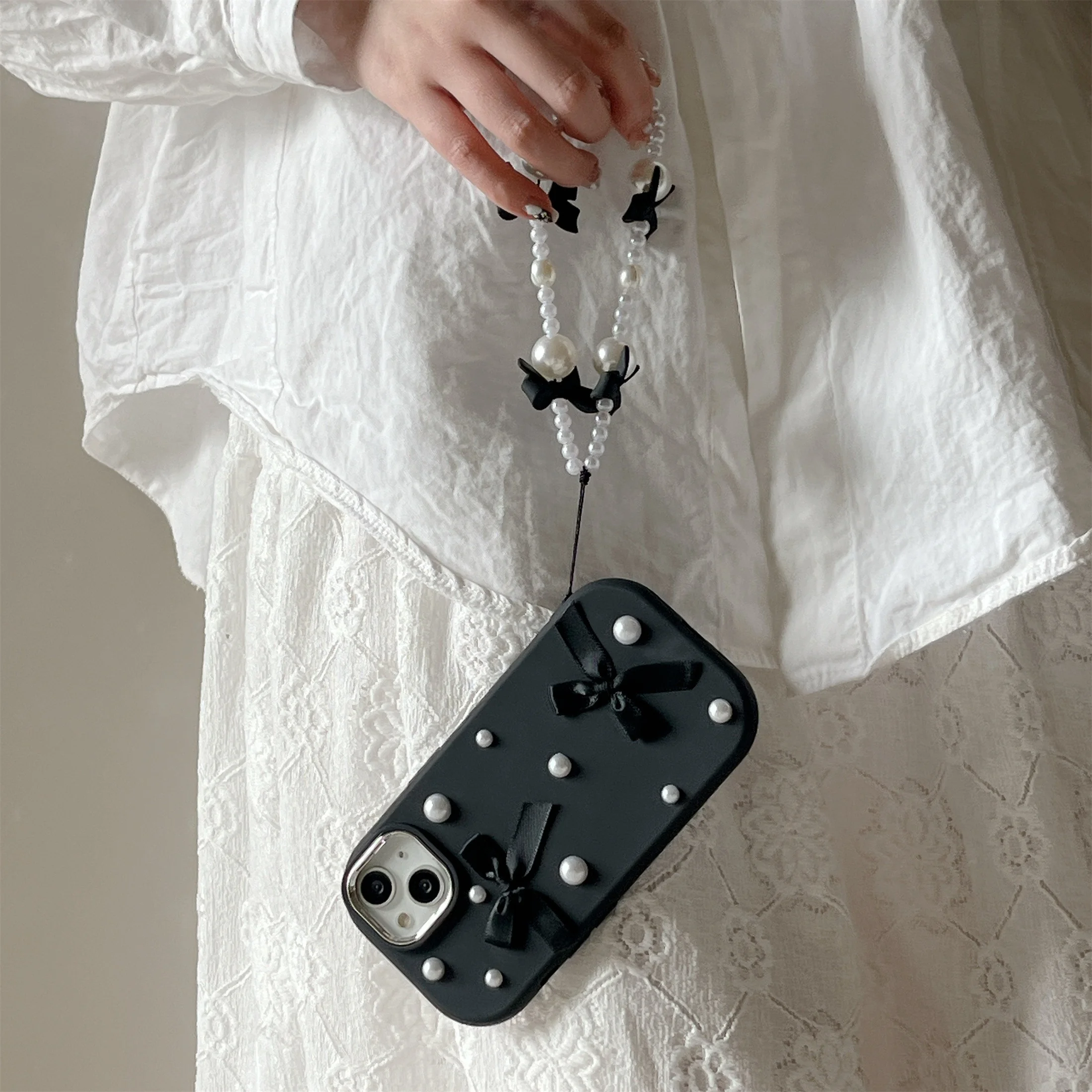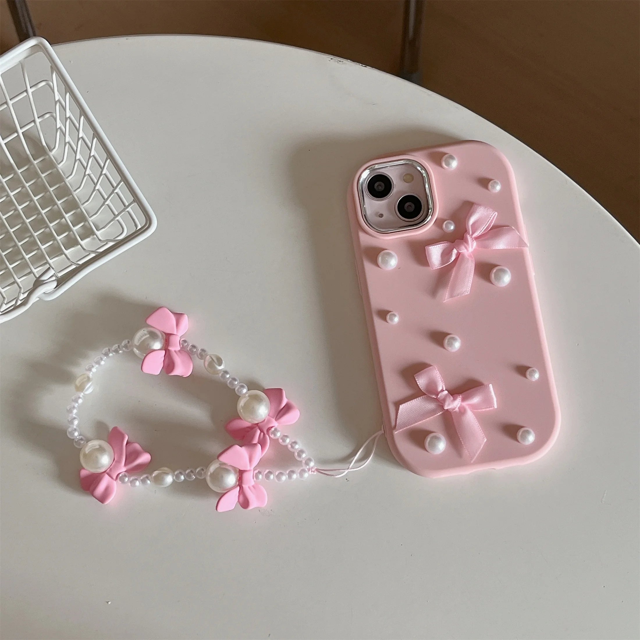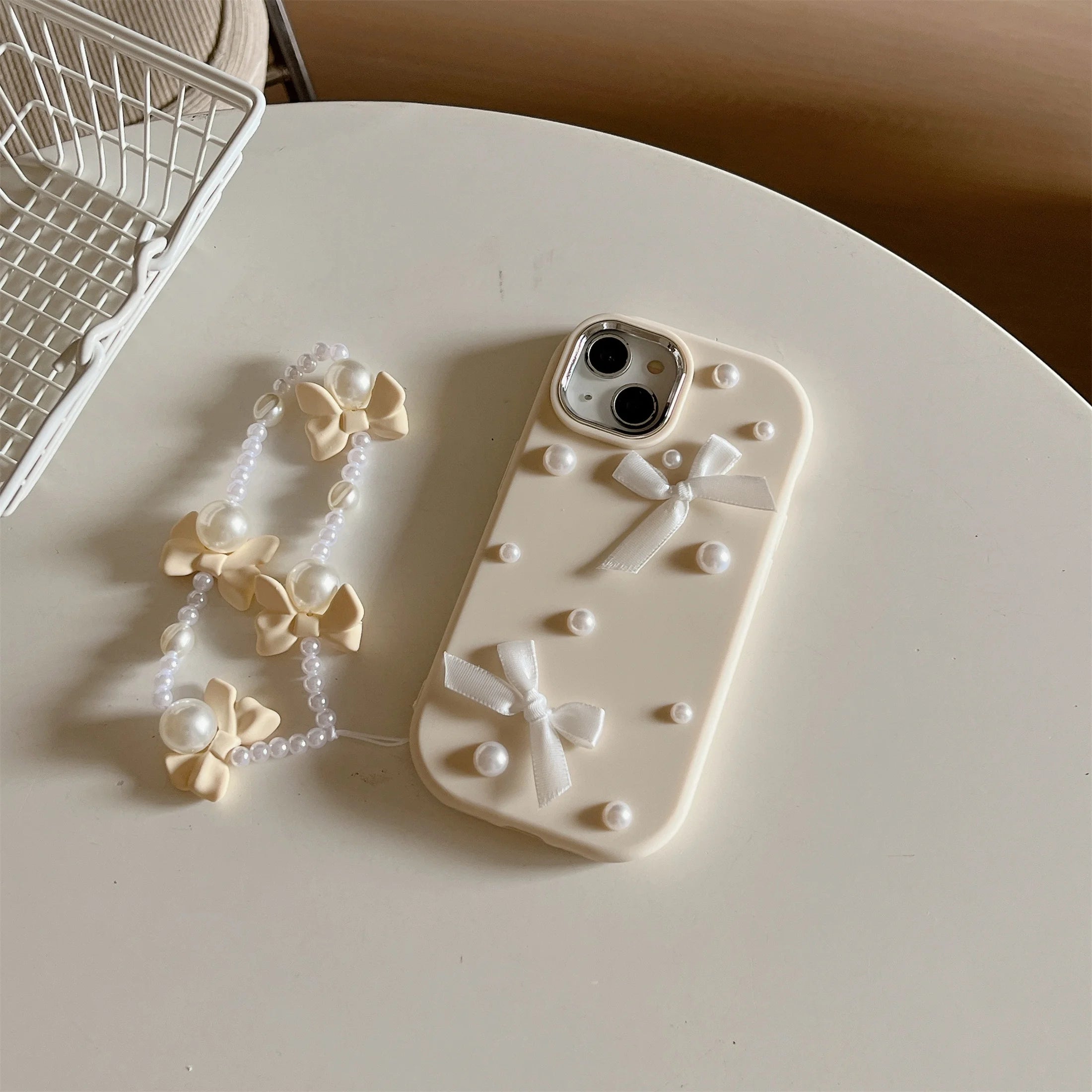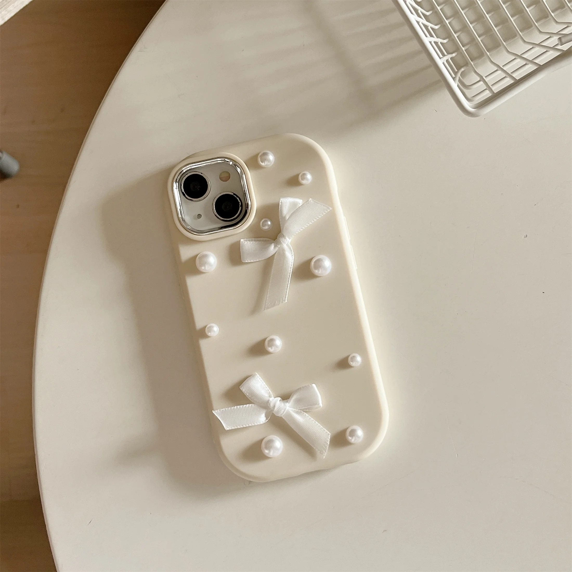 Qfdian For iPhone 15 14 13 12 11 Pro Max Case 3D Pearl Bowknot Drop-proof Silicone Protective Cover