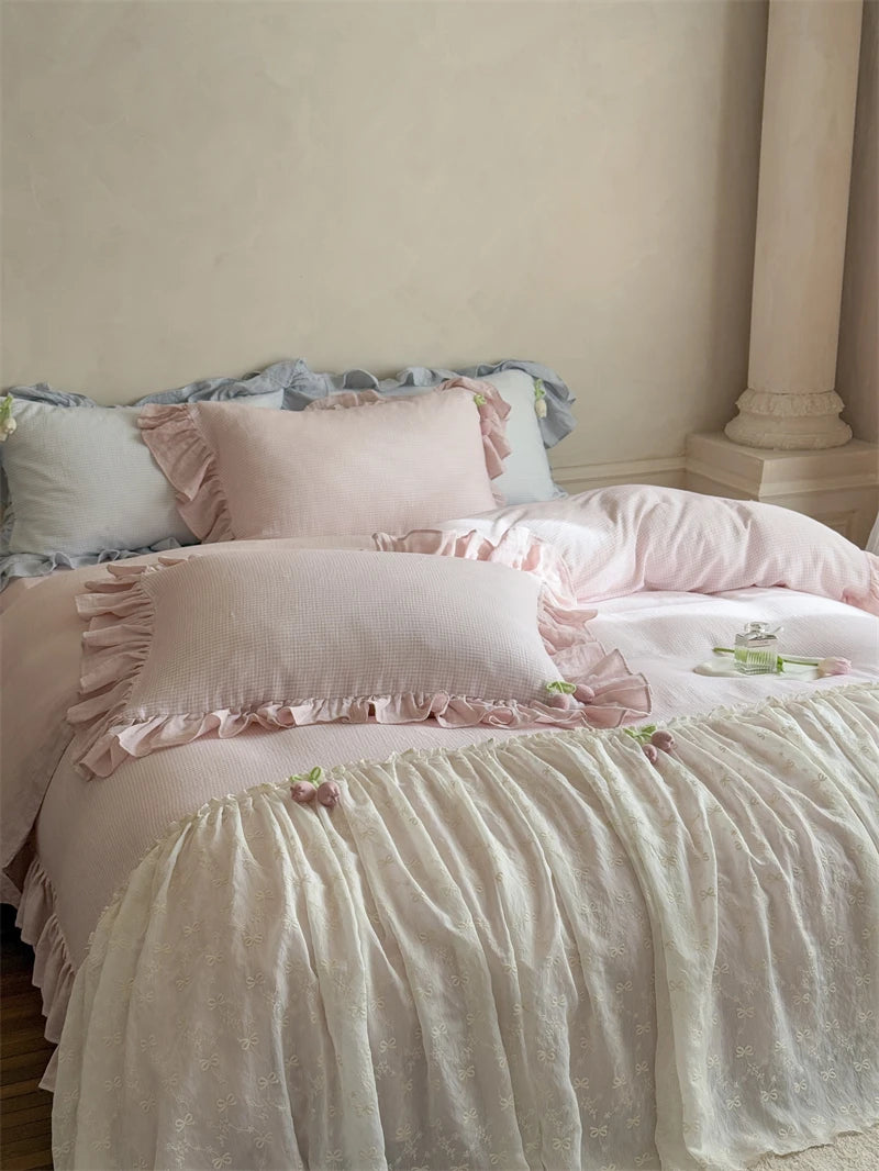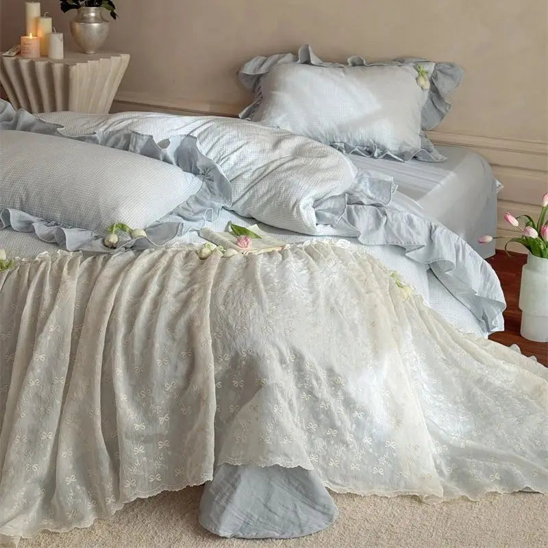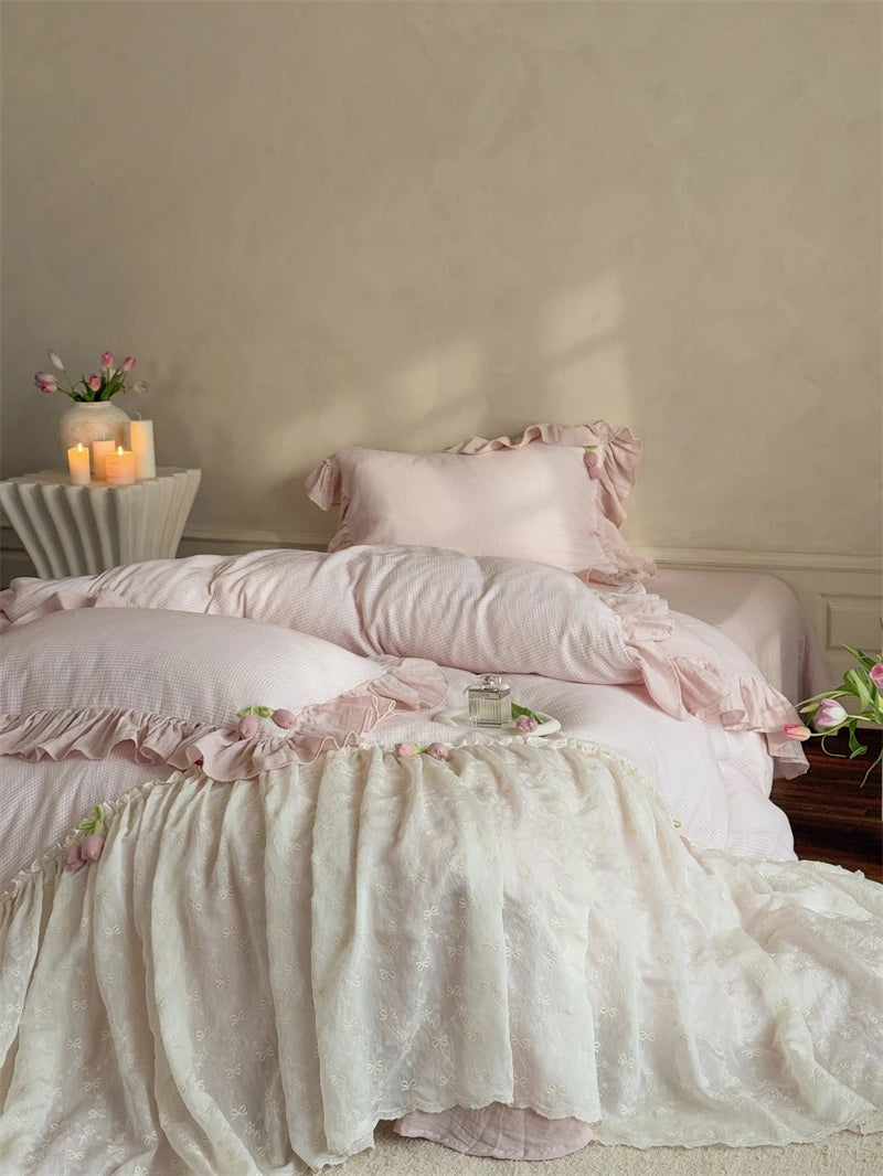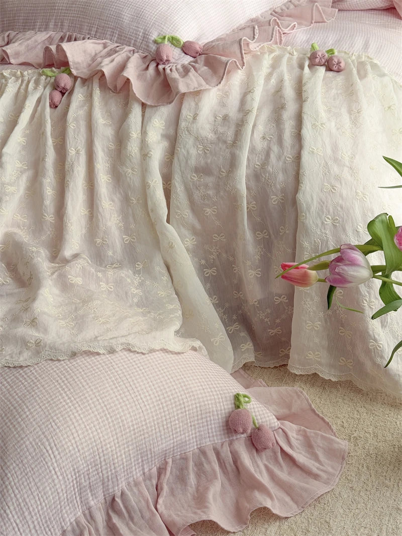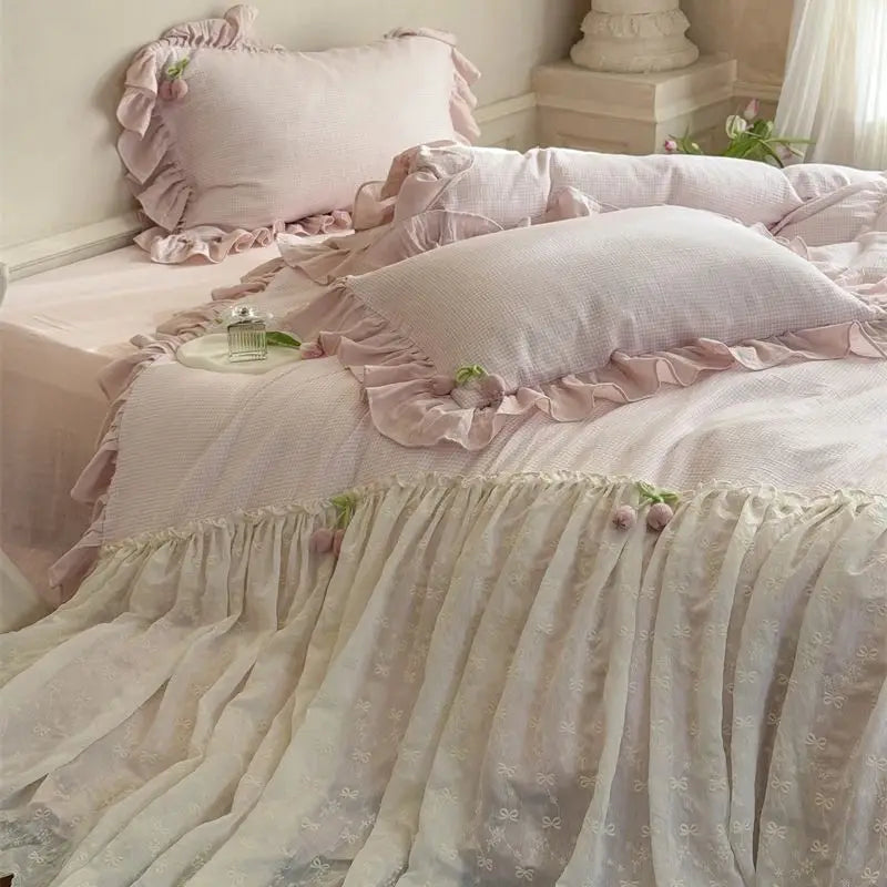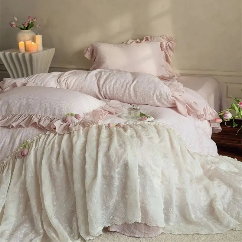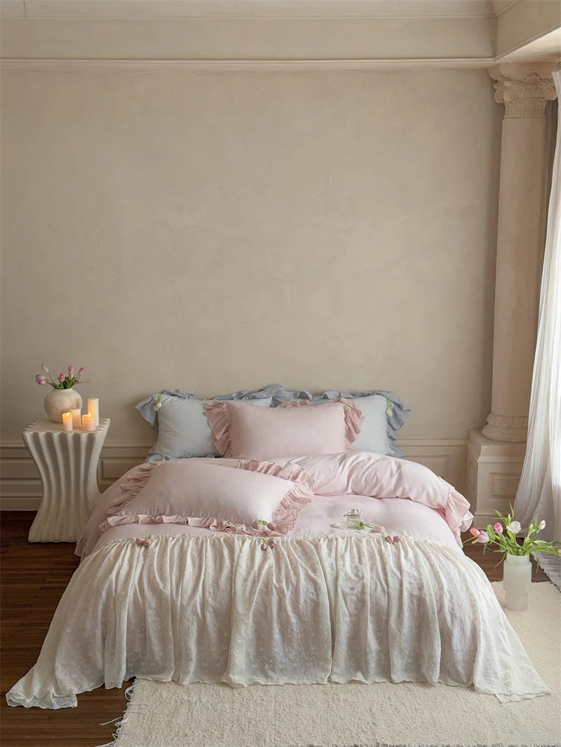 Qfdian French Lace Ruffles Princess Wedding Bedding Set Pure Cotton Double Layer Yarn Soft Duvet Cover Flat/Fitted Bed Sheet Pillowcase