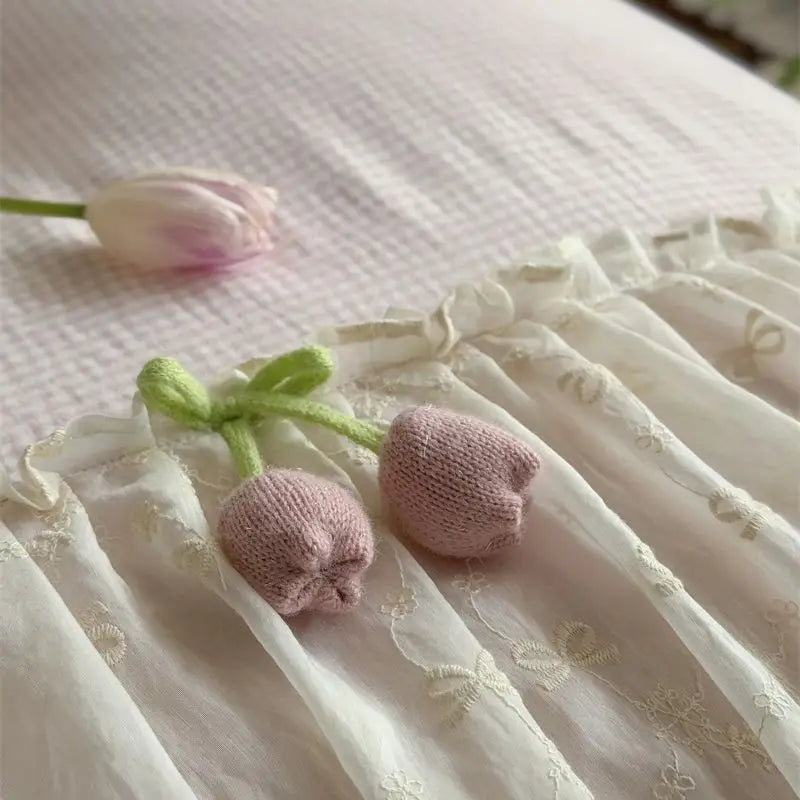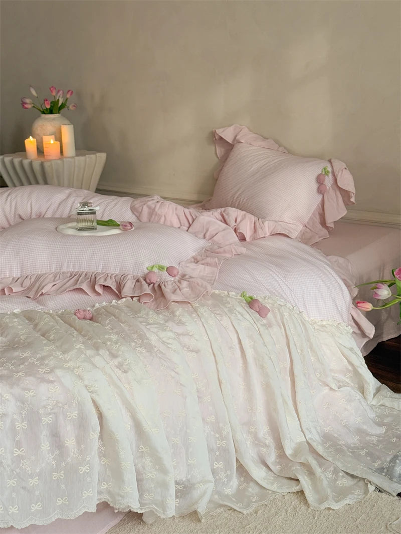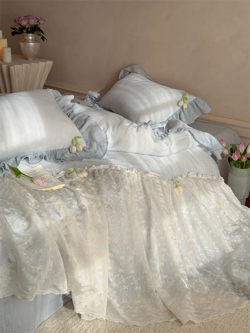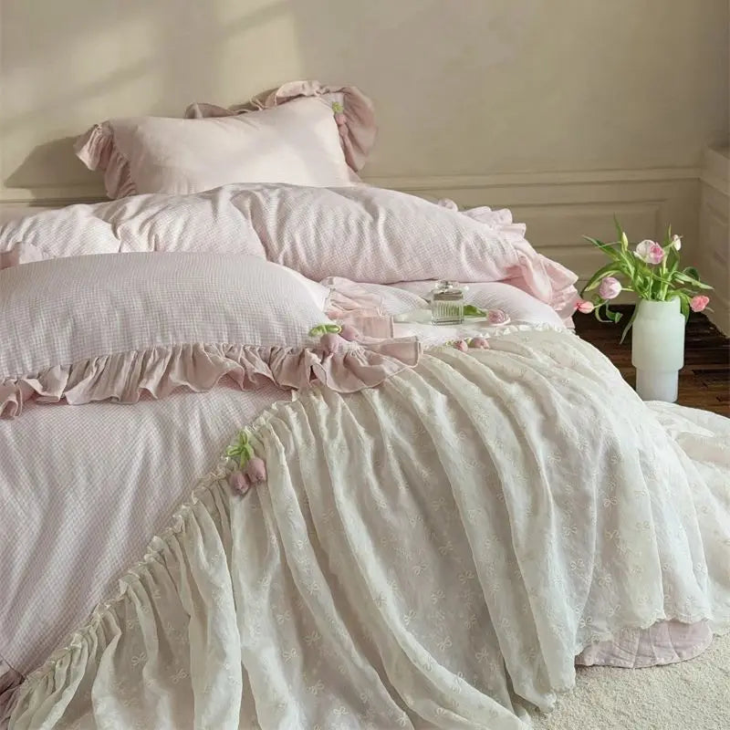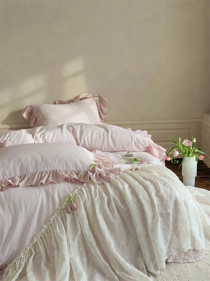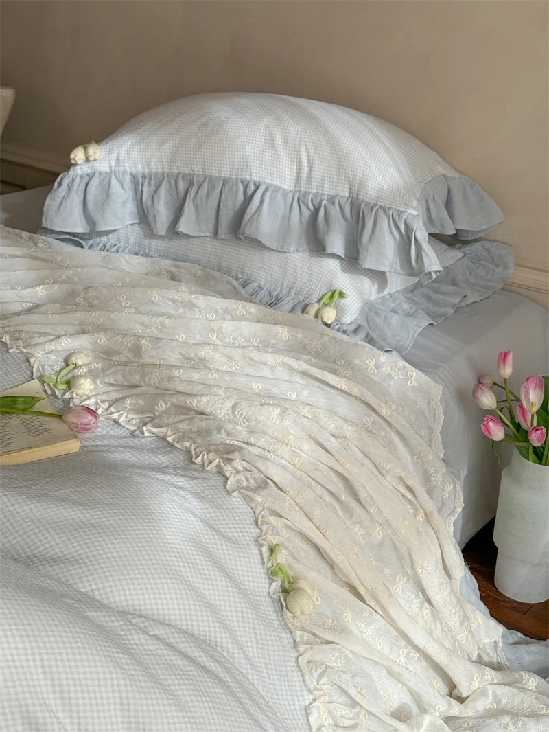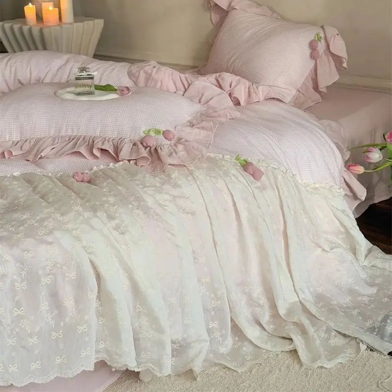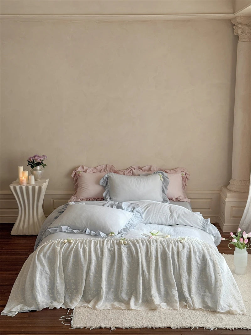 Qfdian French Lace Ruffles Princess Wedding Bedding Set Pure Cotton Double Layer Yarn Soft Duvet Cover Flat/Fitted Bed Sheet Pillowcase